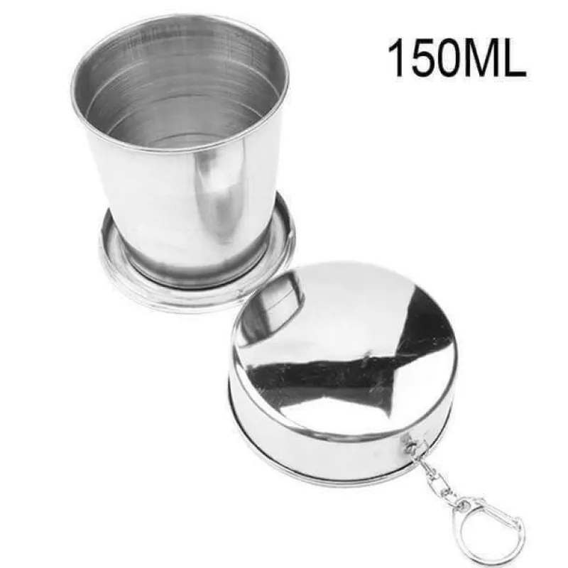 1 x faltbarer, tragbarer Campingbecher aus Edelstahl mit Schlüsselanhänger.