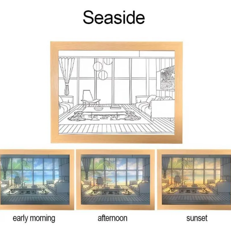 Tauchen Sie ein in eine Vielzahl beruhigender Lichtszenen, darunter „Leerer Raum“, „Hund sonnt sich“, „Meeresküste“ und „Herbst“, die alle darauf ausgelegt sind, eine heitere Atmosphäre in Ihrem Zuhause zu schaffen.