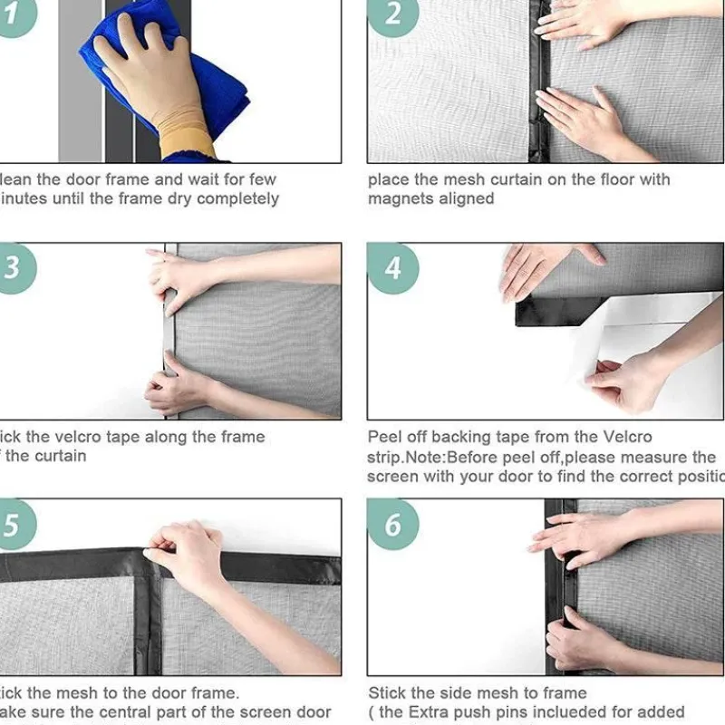 Die Montage ist einfach und erfordert kein Werkzeug. Verstärkte Klebestreifen und hochwertige, rostfreie Nägel sorgen für einen sicheren und dauerhaften Halt. Für optimale Haftung reinigen Sie einfach die Oberfläche Ihres Türrahmens vor der Montage. Der robuste Magnetverschluss sorgt für eine vollständige Abdichtung und schließt mühelos hinter Ihnen, sodass kein manuelles Nachjustieren erforderlich ist.