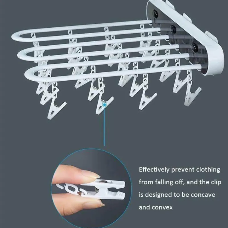 Wir präsentieren unseren innovativen, faltbaren Sockentrockner zur Wandmontage. Er ist mit einem praktischen Ein-Knopf-Mechanismus für eine einfache Bedienung ausgestattet. Dieser vielseitige und platzsparende Wäscheständer erfüllt Ihre Trockenbedürfnisse effektiv, ohne Ihren Wohnraum zu überladen.