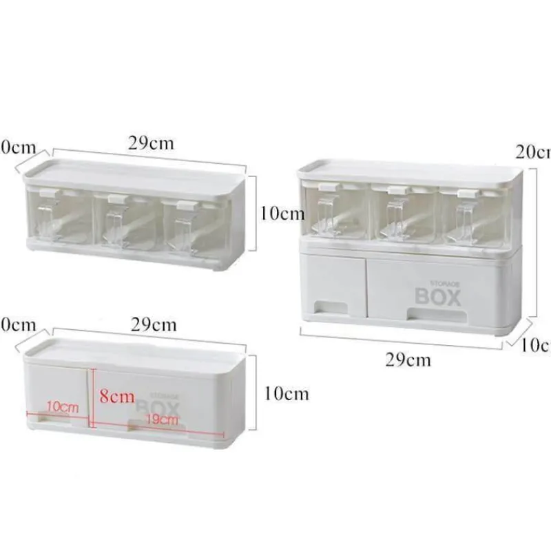 Das Set enthält drei kompakte Boxen, die jeweils für drei verschiedene Gewürzsorten konzipiert sind und so eine vielseitige Ergänzung für Ihre Kochroutine darstellen. Das stapelbare Design nutzt den vertikalen Raum effizient aus und sorgt für Ordnung auf Ihrer Arbeitsfläche, da verschiedene Flaschen und Dosen ordentlich untergebracht werden können.