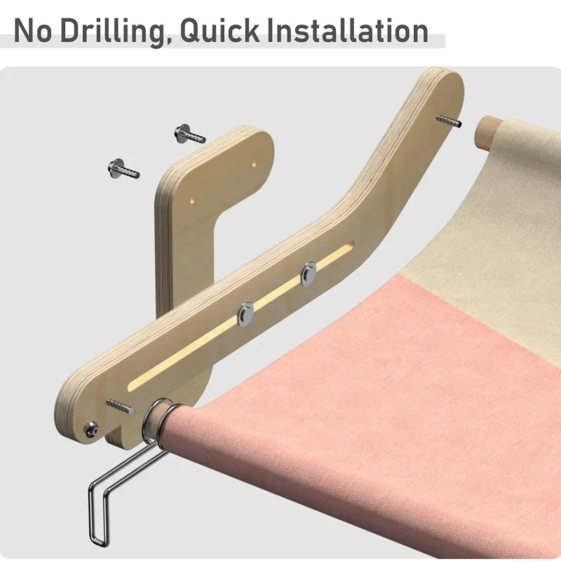 Verschönern Sie das Liegeerlebnis Ihrer Katze mit unserer vielseitigen Holzhängematte. Sie ist so konzipiert, dass sie perfekt in verschiedene Bereiche wie Fensterbänke, Schubladen, Stuhllehnen und Nachttische passt. Bei Nichtgebrauch lässt sich diese Katzenhängematte einfach und ohne Demontage entfernen.
