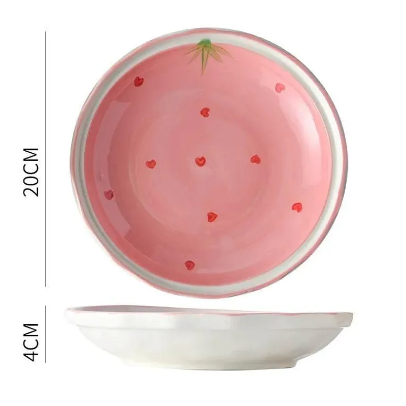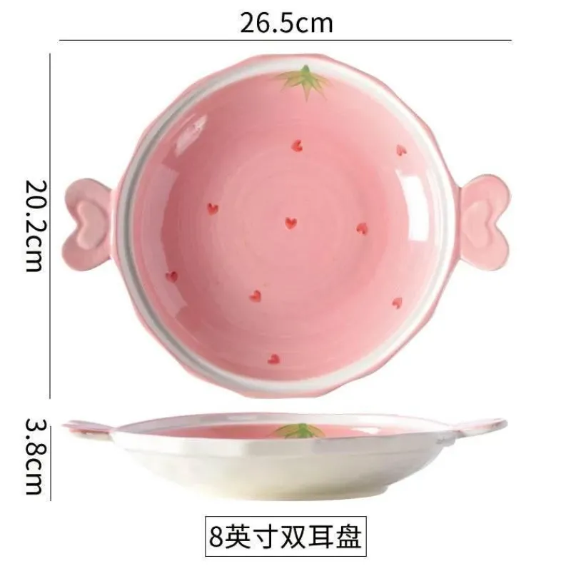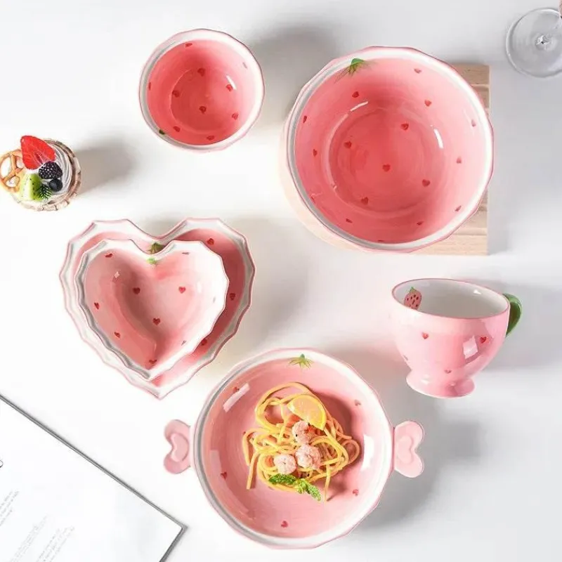 Erleben Sie den Charme dieses handgefertigten Keramikgeschirrsets mit einer entzückenden rosa Reissuppenschüssel und einem Teller, beide wunderschön verziert mit einem süßen Erdbeermotiv. Die Kollektion aus hochwertiger Keramik besticht durch ihre einzigartige Herzform, die nicht nur Ihr Esserlebnis bereichert, sondern auch jedem Tisch eine romantische Note verleiht.