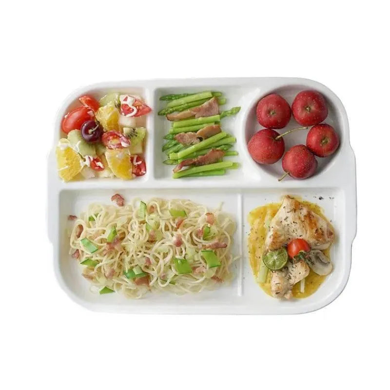 Mit seiner schlanken, rechteckigen Form und dem minimalistischen Design passt dieser Teller perfekt zu jedem Tischgedeck. Die Unterteilung bietet die perfekte Lösung zum Trennen verschiedener Speisen und eignet sich ideal zur Portionskontrolle oder zur Präsentation einer köstlichen Auswahl an Snacks.
