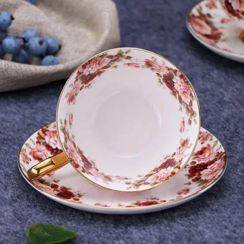 Entdecken Sie die raffinierte Eleganz unseres floralen Teeservices aus Bone China, das Ihr Teeerlebnis veredelt. Diese wunderschön gefertigte Kollektion umfasst eine zarte 200-ml-Teetasse, eine passende Untertasse und einen Löffel, alle verziert mit filigranen Blumenmustern, die Anmut und Raffinesse ausstrahlen.