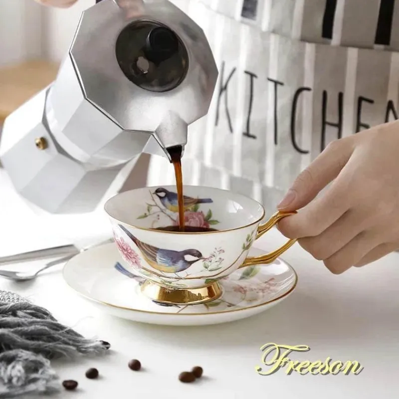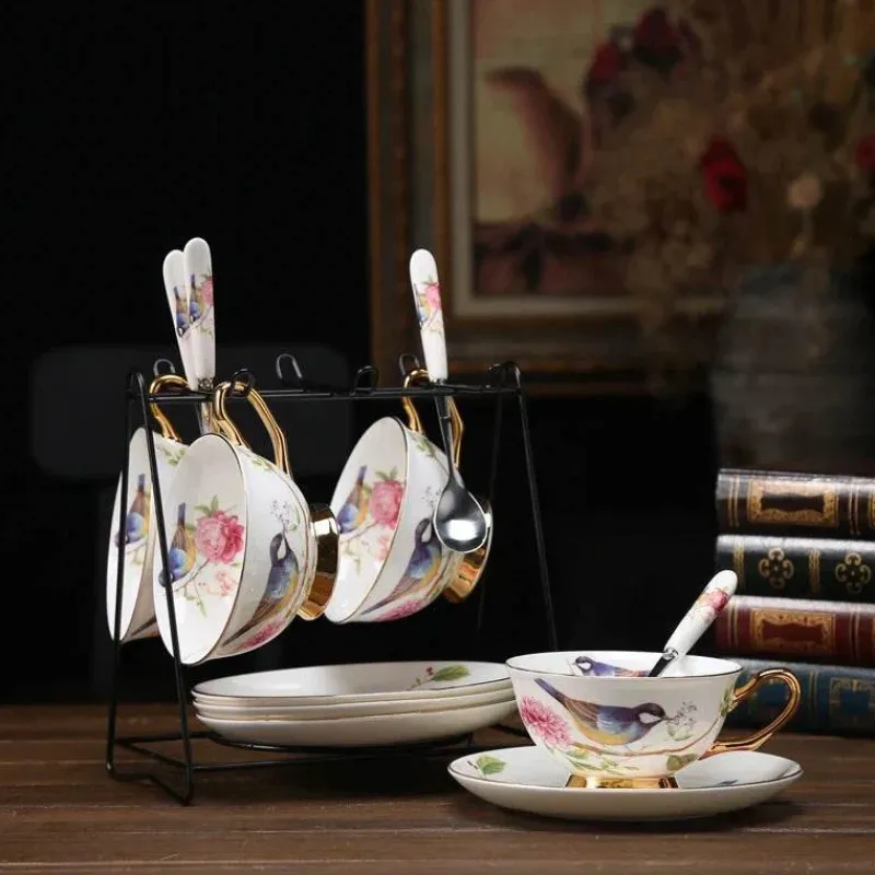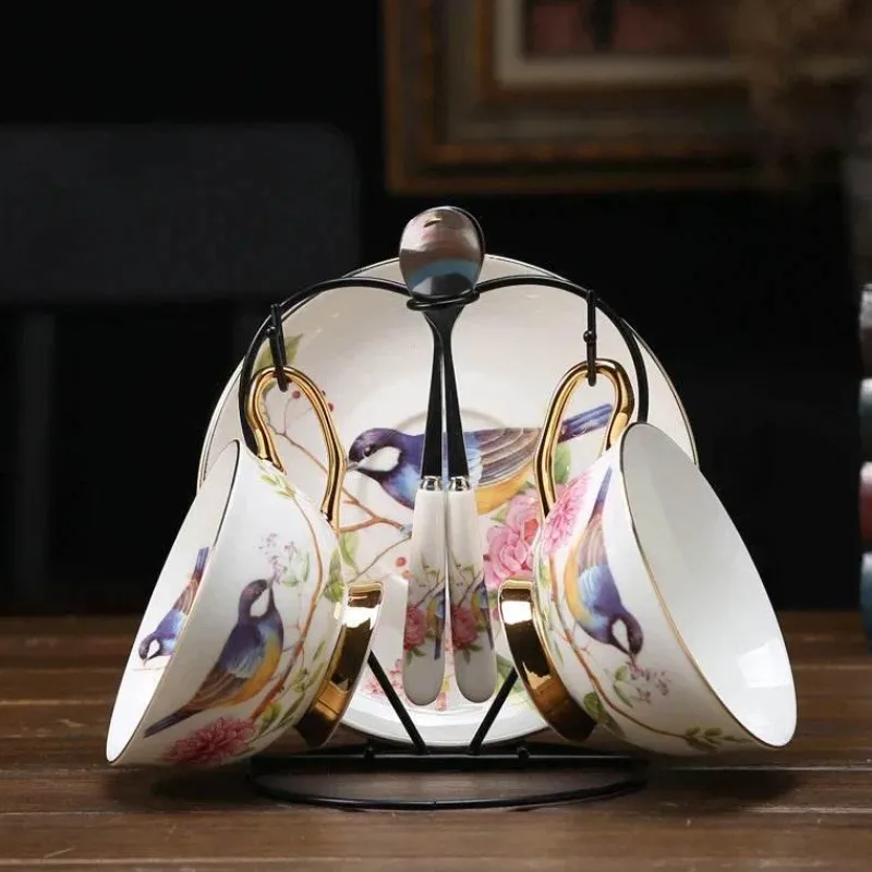 Erleben Sie den Zauber traditioneller Teezeit mit dem Teetassen-Set aus Bone China mit charmantem Pastoral-Vogel-Design. Diese elegante Kollektion bereichert Ihr britisch inspiriertes Café-Erlebnis und wurde sorgfältig für alle gefertigt, die edles Trinkgeschirr zu schätzen wissen.