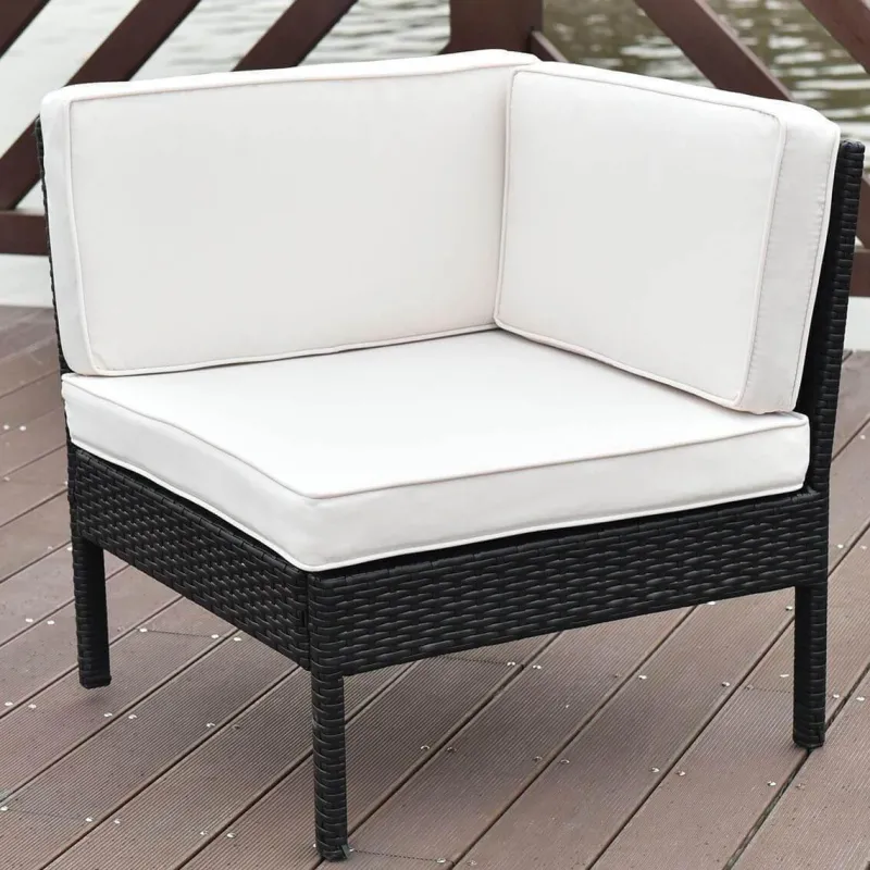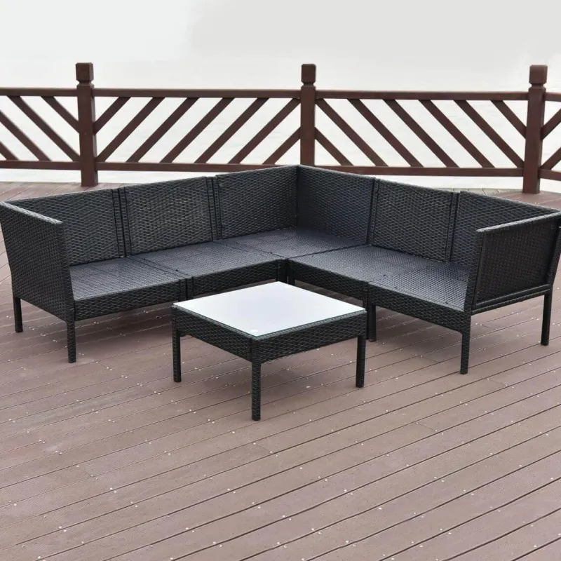 Verschönern Sie Ihr Outdoor-Erlebnis mit unserem 6-teiligen Gartensofa-Set aus schwarzem Rattan. Es umfasst drei Sofas ohne Armlehnen, zwei Ecksofas und einen Couchtisch. Diese stilvolle und moderne Sitzgruppe bietet Ihnen und Ihrer Familie bequeme und gemütliche Sitzgelegenheiten auf Ihrer Terrasse, im Garten oder im Hinterhof. Die klaren Linien des Designs werten jeden Außenbereich mühelos auf.