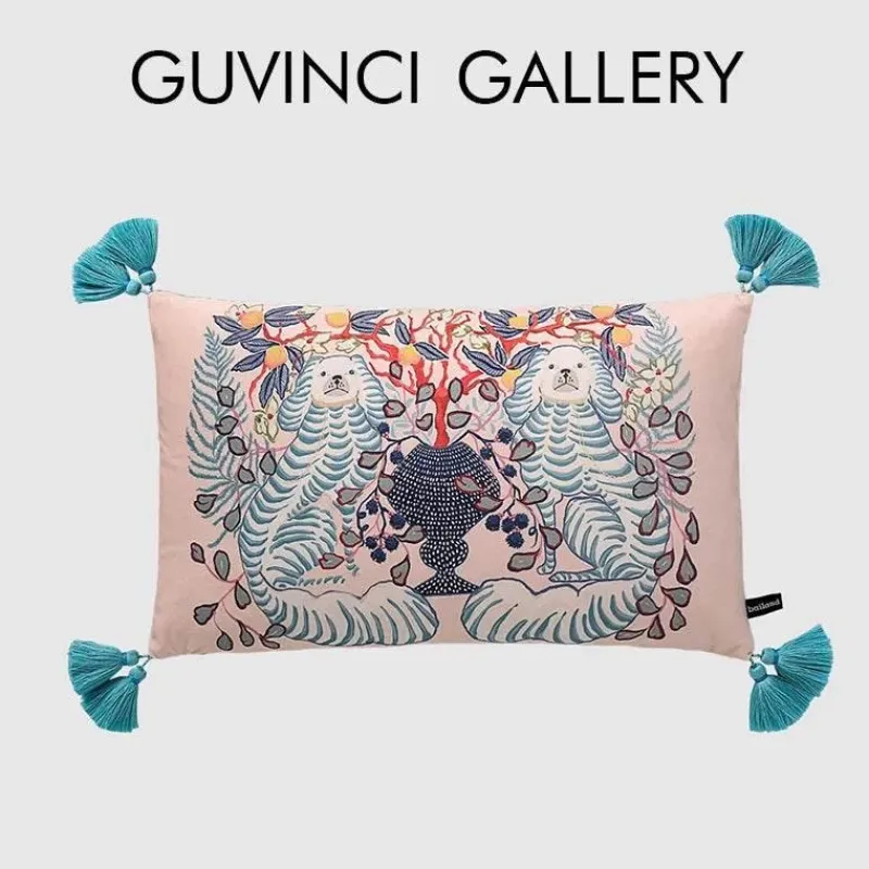 Verwandeln Sie Ihre Umgebung mit dem blauen Kissenbezug mit Löwenhund und Zitronenbäumen in einen gemütlichen Rückzugsort. Dieses Stück vereint Stil, Komfort und Umweltbewusstsein und wertet Ihre Einrichtung mit seinem künstlerischen Charme auf.