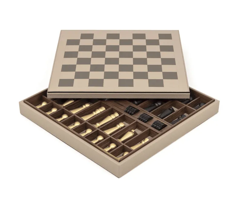 Experience the elegance of versatility with our bicolour game board that seamlessly transitions between chess and checkers. This sophisticated set features: