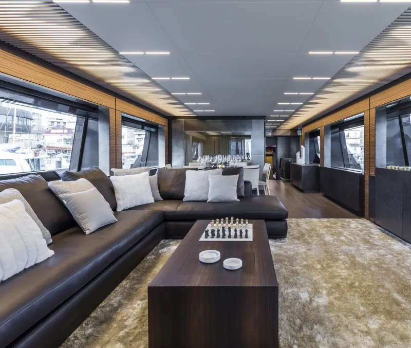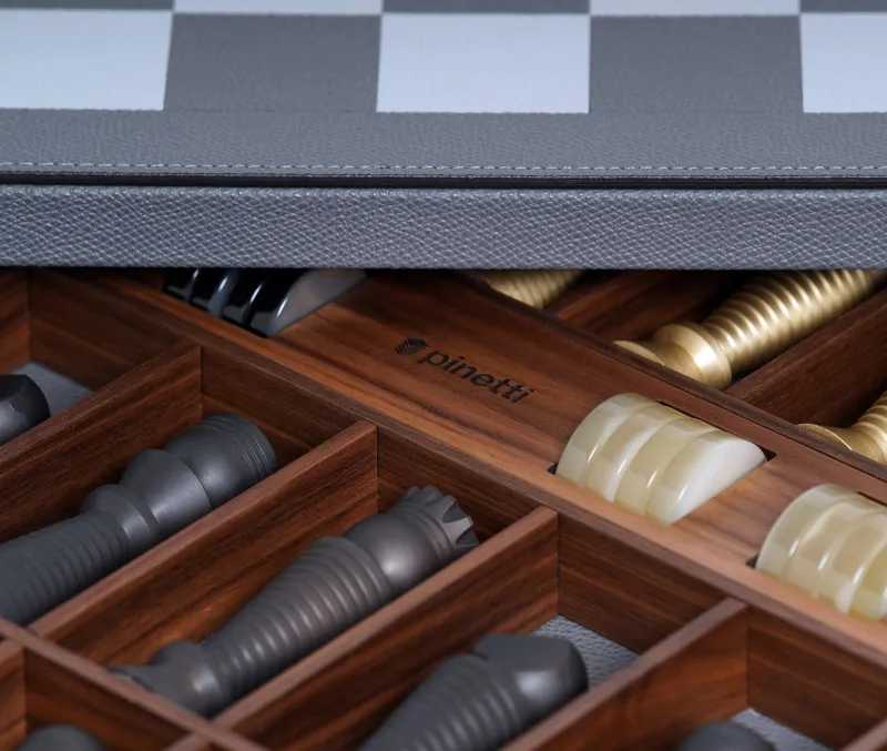 - An interior storage tray for the pearled checkers and black and brass-finished chess pieces