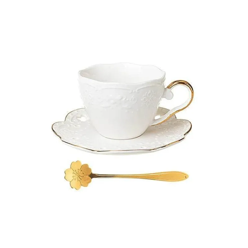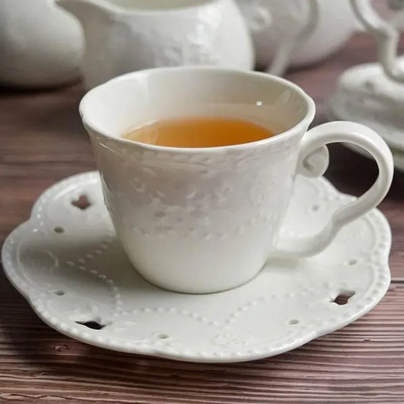 Dieses Service aus hochwertigem Porzellan strahlt Luxus aus, während die reinweiße Oberfläche jedem Tisch einen Hauch zeitloser Schönheit verleiht. Das charmante Reliefmuster auf Tassen und Untertassen verleiht einen Vintage-Charme, und der passende Löffel verleiht ihm einen Hauch von Raffinesse.