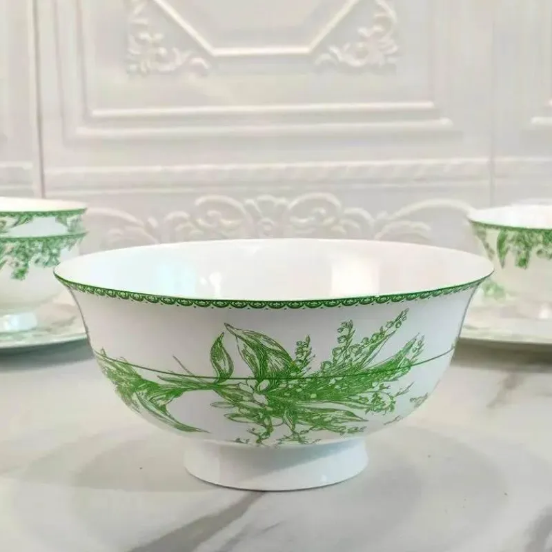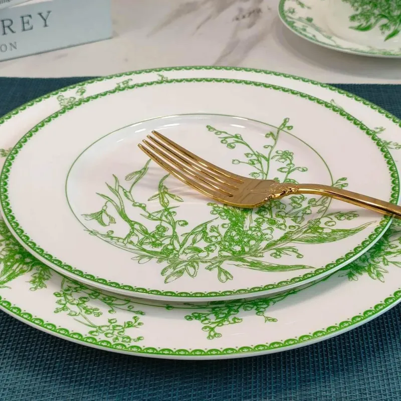 Wir präsentieren das Maiglöckchen-Geschirrset aus Bone China, eine zeitlose Ergänzung Ihrer Essecke, die Ihren Mahlzeiten Eleganz verleiht. Mit größter Präzision und Liebe zum Detail gefertigt, präsentiert dieses Geschirrset bezaubernde Blumenmuster, die jedem Tisch einen Hauch von Eleganz verleihen. Die raffinierten Designs sind ein optischer Genuss und machen jede Mahlzeit zu etwas Besonderem und Einladendem.