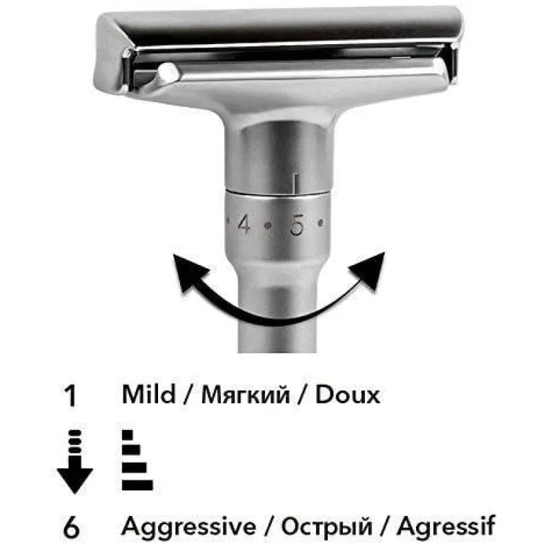 Der geriffelte Griff ermöglicht eine präzise Kontrolle und sorgt für ein sanftes Gleiten über die Haut. Doppelklingen-Sicherheitsrasierer wie dieser sorgen für eine gründliche Rasur und minimieren gleichzeitig Hautirritationen, die häufig bei Mehrklingensystemen auftreten. Merkur-Rasierer sind mit kostengünstigen, recycelbaren Doppelklingen kompatibel und somit eine kostengünstige Wahl für Ihre Rasur.