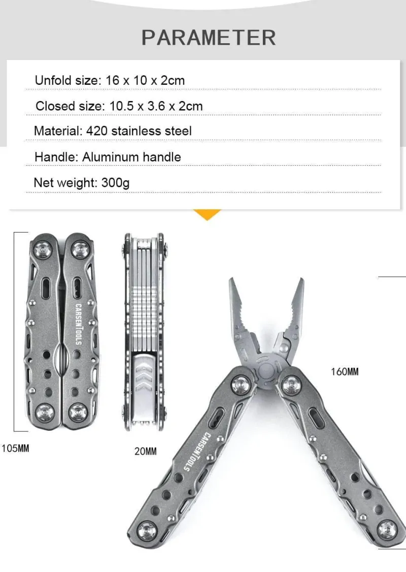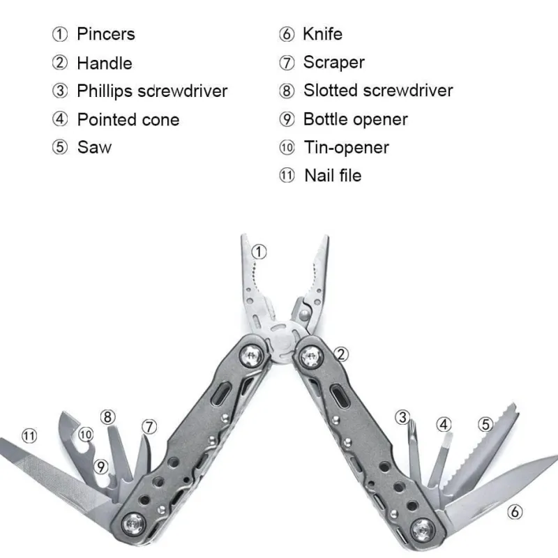Im Paket enthalten ist eine tragbare Multitool-Drahtschneider-Campingzange, die Ihnen bei Ihrer nächsten Expedition zur Seite steht.