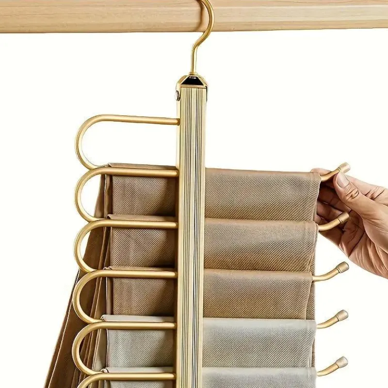 Halten Sie Ihre Kleidung sauber und geordnet und sparen Sie gleichzeitig wertvollen Platz mit diesem drehbaren, zusammenklappbaren 6-in-1-Hosenbügel, ein Muss für jede Garderobe zu Hause oder auf Reisen!