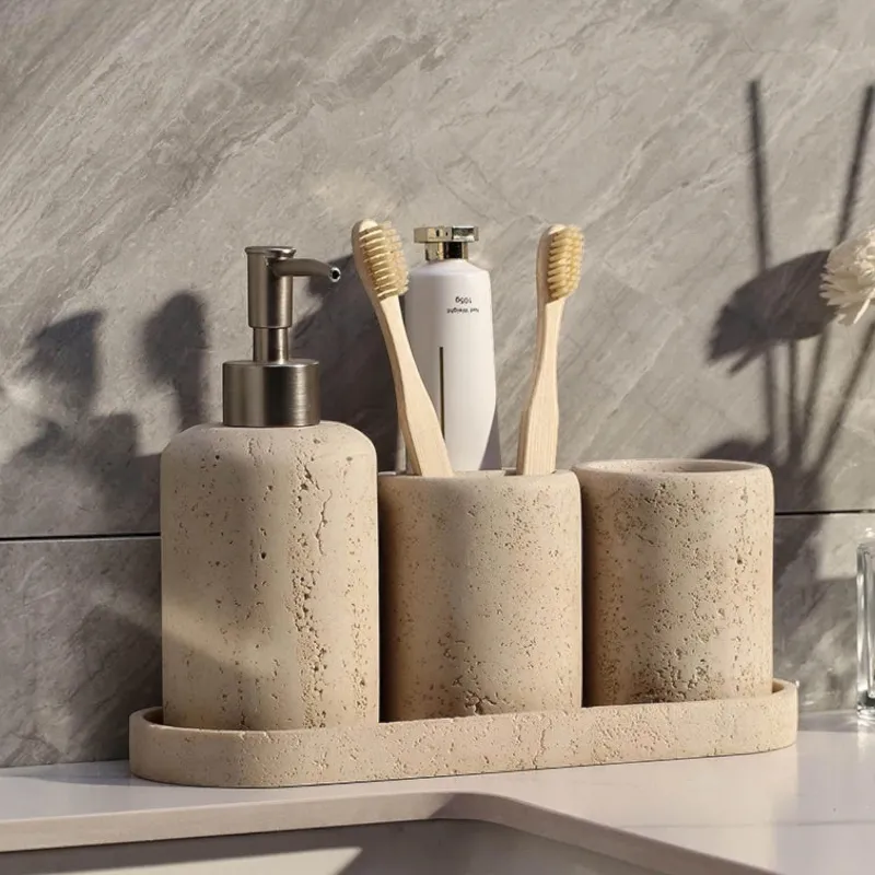 Transform your bathroom into a serene oasis with the Luxe Sandstone Bathroom Collection, a thoughtfully curated selection of bath accessories that seamlessly combines natural beauty with contemporary design. Each piece, from the soap dispenser to the toothbrush holder, is meticulously crafted from premium sandstone, highlighting unique textures and warm tones that infuse your space with an organic essence.