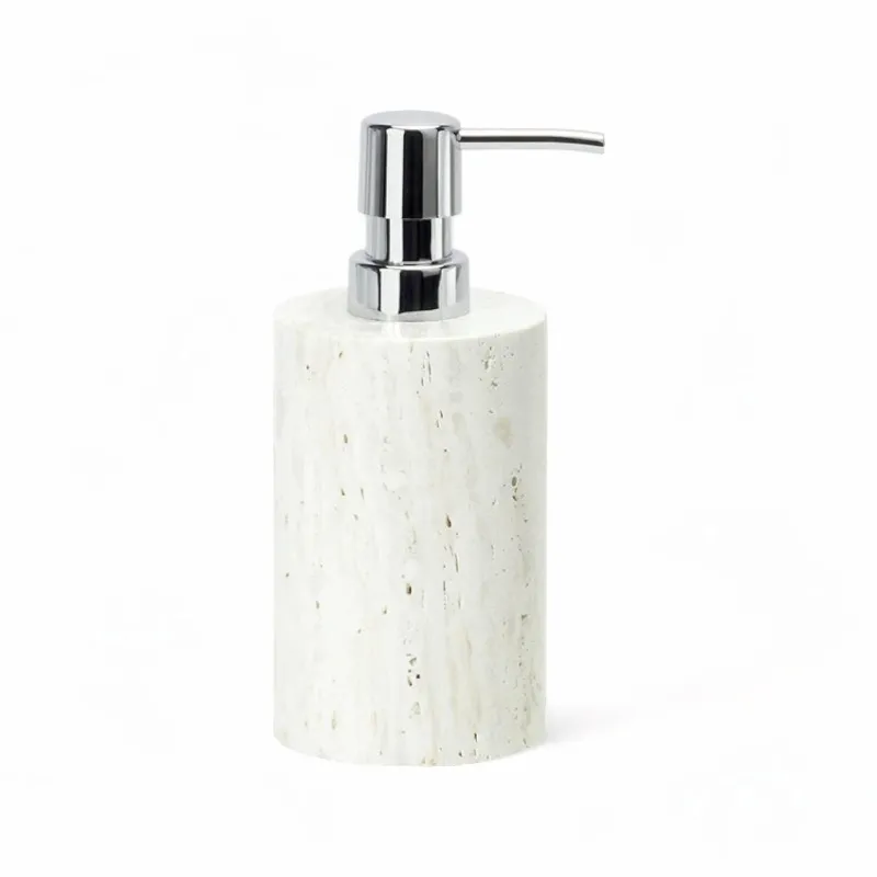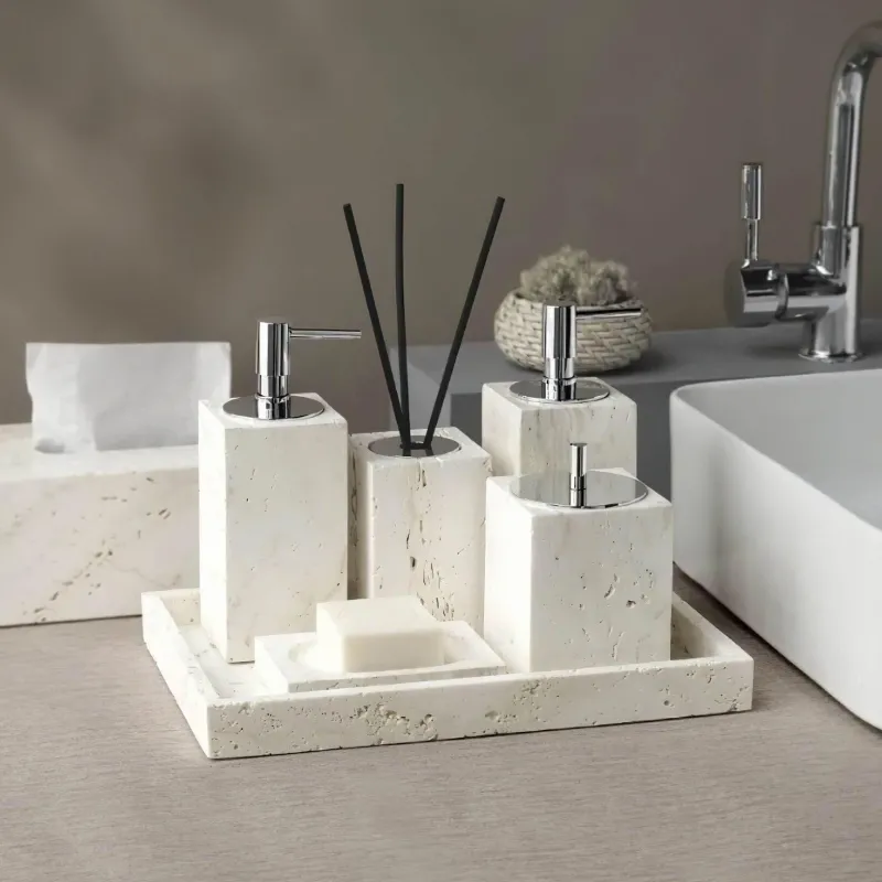 This collection goes beyond just floor tiles, offering a selection of thoughtfully designed accessories such as soap dispensers and toothbrush holders. Each piece seamlessly combines organic aesthetics with practical functionality. The tactile quality of the stone enhances the sensory experience, making travertine a perfect choice for elevating both style and comfort in your bathroom.