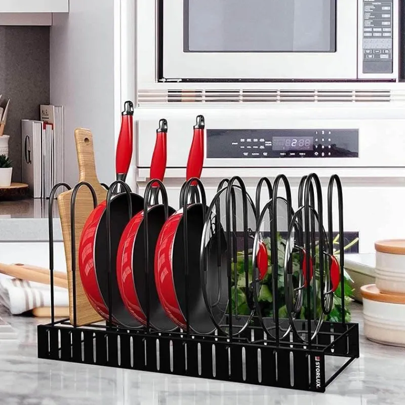– 1x verstellbarer mehrstufiger Küchenpfannen-Organizer.
