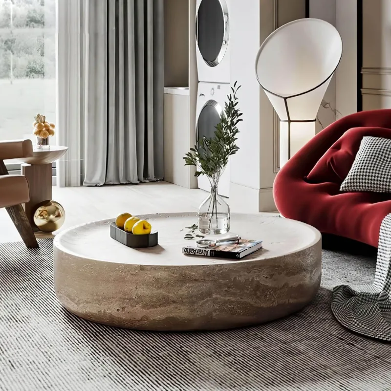 Entdecken Sie den Zariah Travertin Couchtisch, ein atemberaubendes Herzstück, das Luxus und Eleganz vereint. Dieser runde Tisch ist fachmännisch aus massivem Travertin gefertigt und besticht durch seine reiche natürliche Textur und einzigartige Maserung, die seine zeitlose Eleganz unterstreicht. Mehr als nur ein funktionales Objekt, ist er ein Statement erlesenen Geschmacks und wertet mit seiner opulenten Präsenz mühelos das Ambiente Ihres Wohnraums auf.