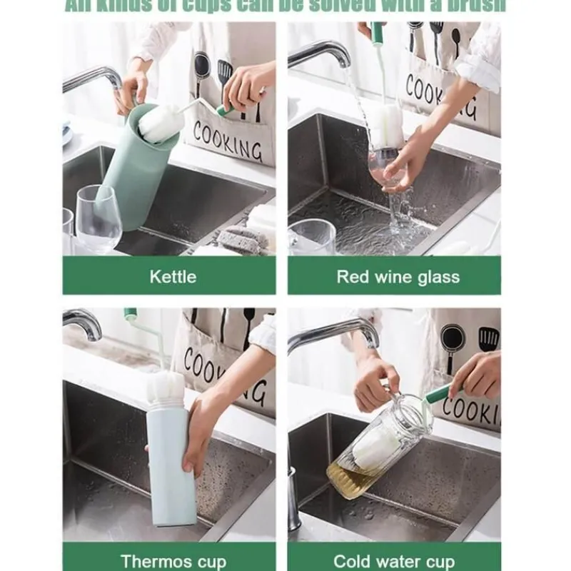 Das Wasserflaschenreinigungsset enthält eine gebogene Flaschenbürste mit 360-Grad-Drehung. Das schlanke Design verfügt über einen langen, rutschfesten Griff für bequemen Halt. Der weiche Schwamm und die spezielle Bürste an der Spitze sind sanft zu Oberflächen und entfernen effektiv Schmutz, ohne Karaffen, Wasserkocher, Mixer oder Glaswaren zu zerkratzen.
