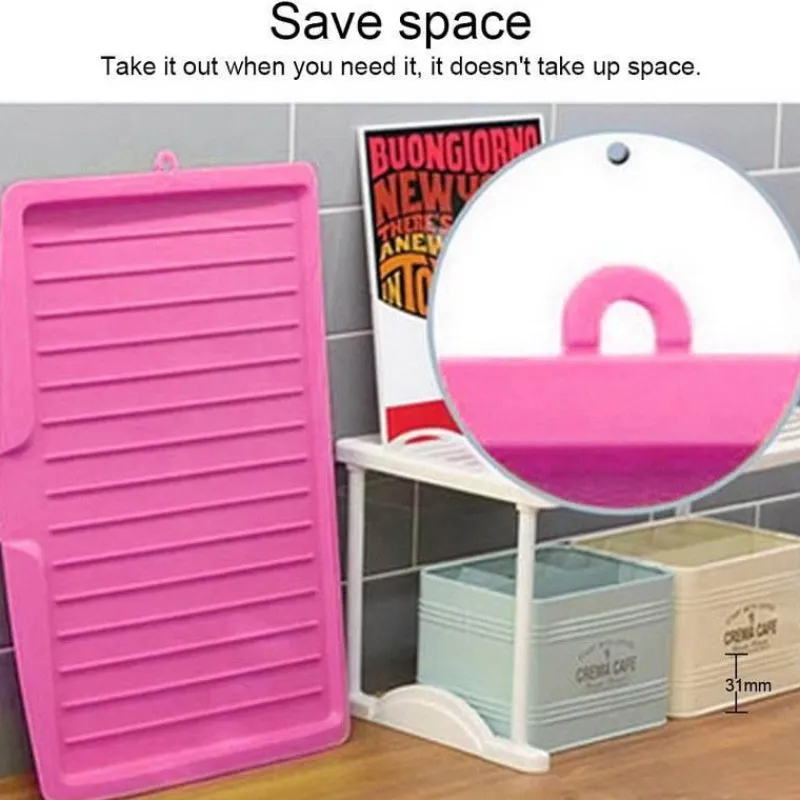 Dieses praktische Tablett ist flexibel und leicht zu verstauen. Es lässt sich mühelos zusammenfalten und verstauen, wenn es nicht benötigt wird. So bleibt Ihre Küche ordentlich und organisiert.