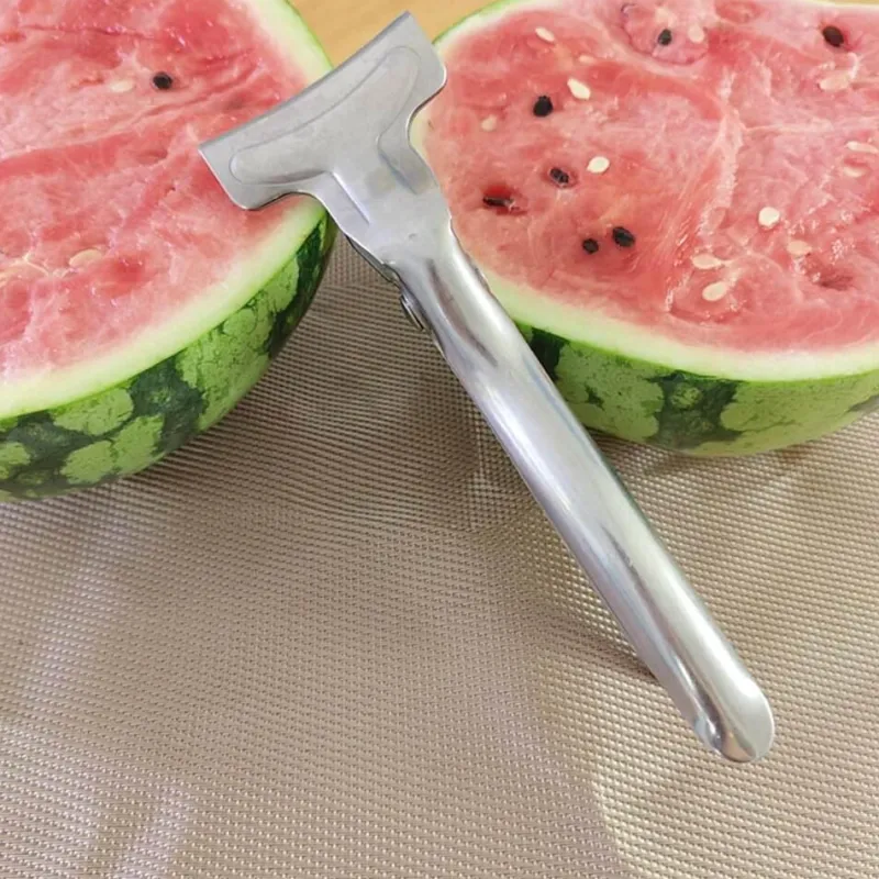 Mit unserem Halbschneider aus Edelstahl schneiden Sie Wassermelonen mühelos. Schneiden Sie die Wassermelone einfach mit einem Messer ein, führen Sie den Spezialöffner in den Schnitt ein und teilen Sie die Frucht mit dem Clip in zwei perfekte Hälften.