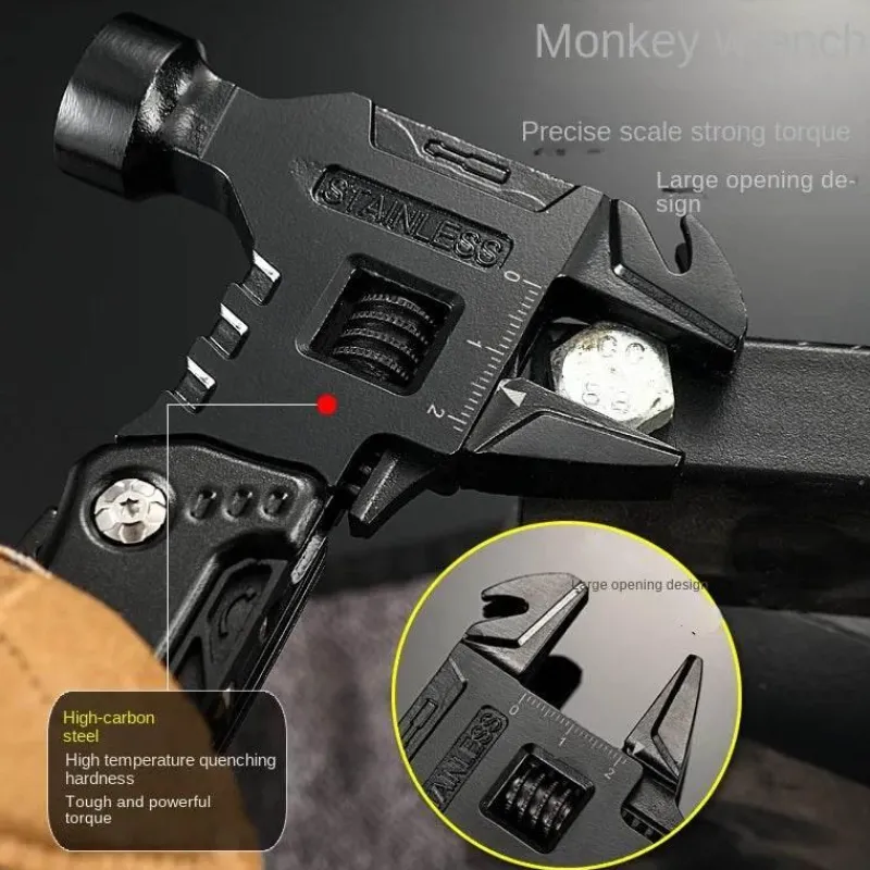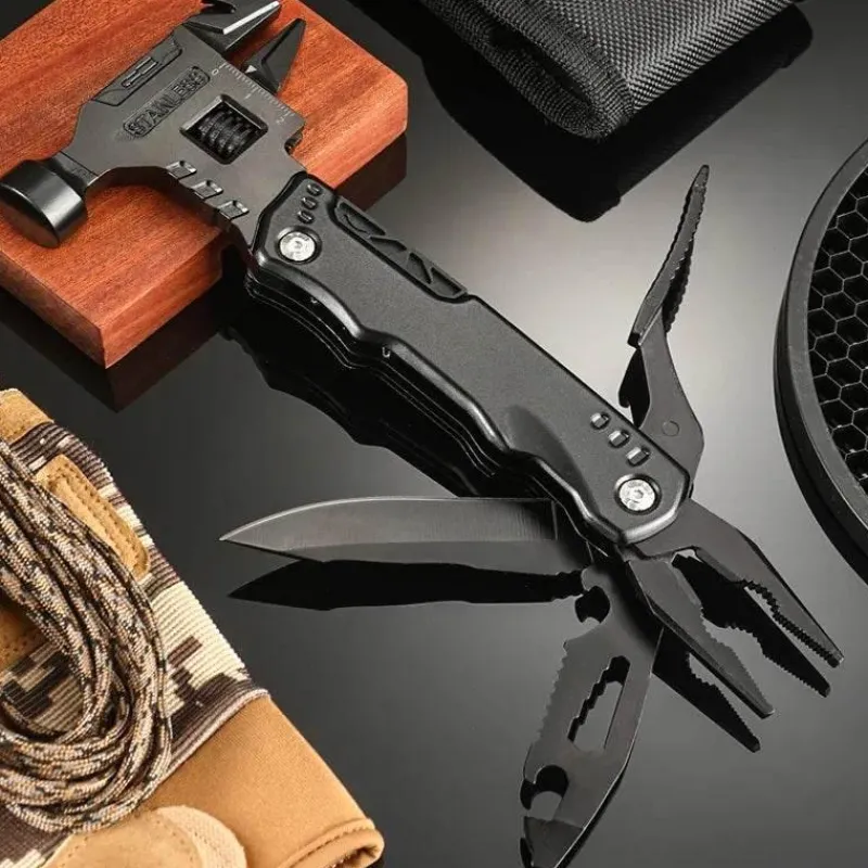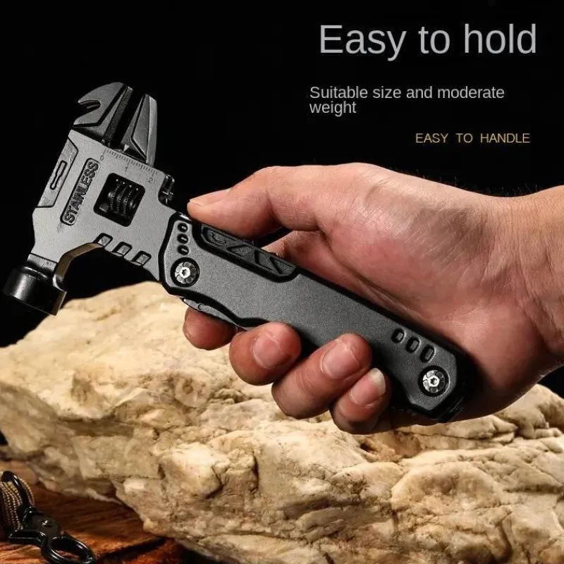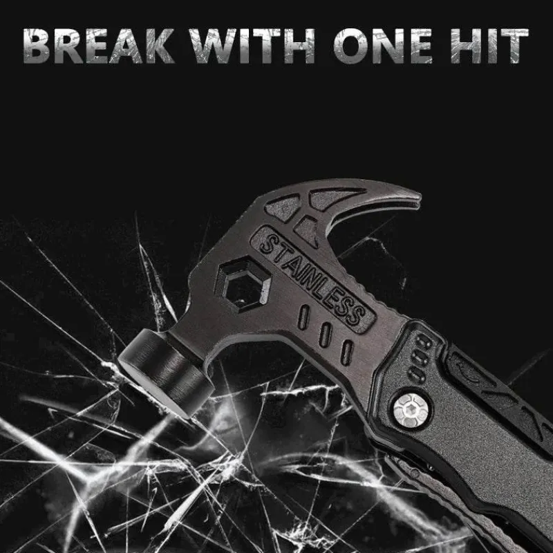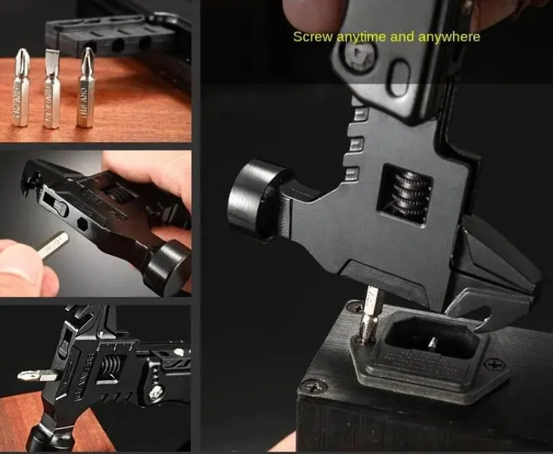 Dieses Multifunktionswerkzeug vereint mehrere wichtige Funktionen, darunter einen Minihammer, eine Zange, einen Flaschenöffner, Schraubendreher-Bits und einen Nagelzieher, und ist damit ein unschätzbarer Helfer für eine Vielzahl von Aufgaben. Zu Hause eignet es sich perfekt für Heimwerkerprojekte und Möbelreparaturen. In der Natur vereinfacht es den Zeltaufbau und das Holzhacken. Unterwegs dient es als zuverlässiges Werkzeug für Notfälle und zur Selbstrettung.