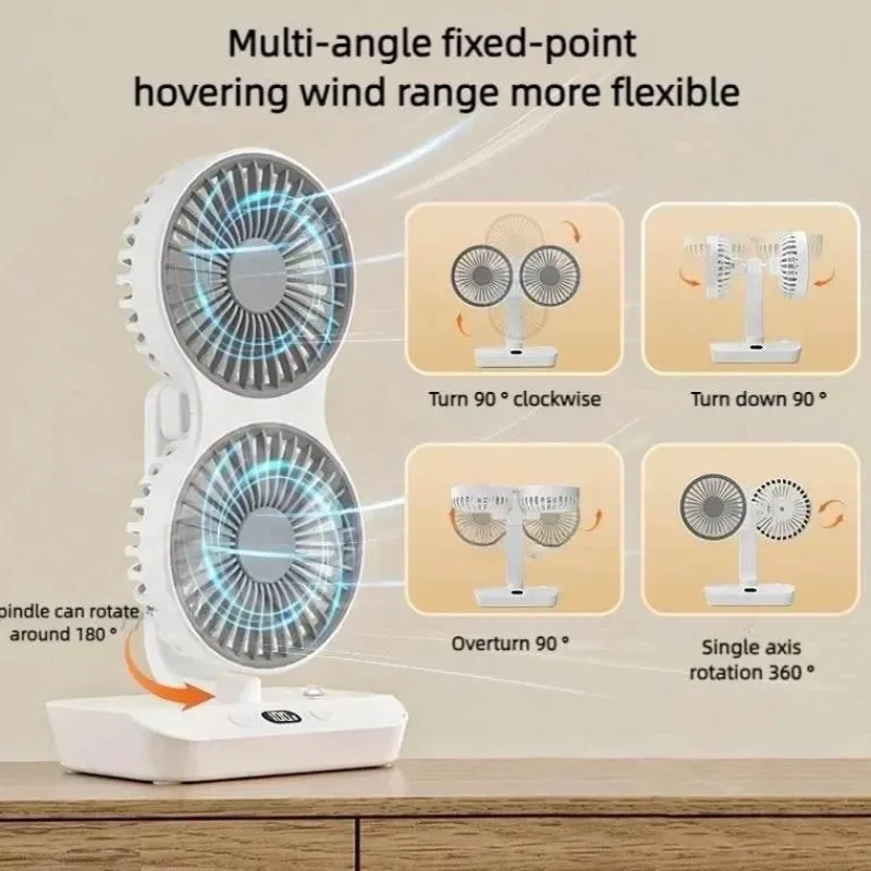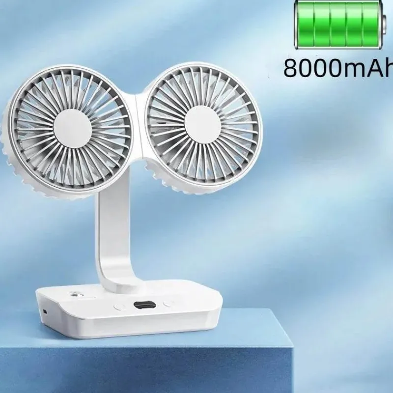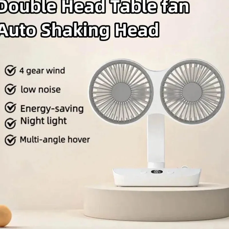 *Was sind die Hauptmerkmale?* Zu den wichtigsten Merkmalen gehören zwei verstellbare Ventilatorköpfe, eine energieeffiziente LED-Nachtlampe, eine leichte ABS-Konstruktion und ein Design, das verschiedene Wohnästhetiken aufwertet.