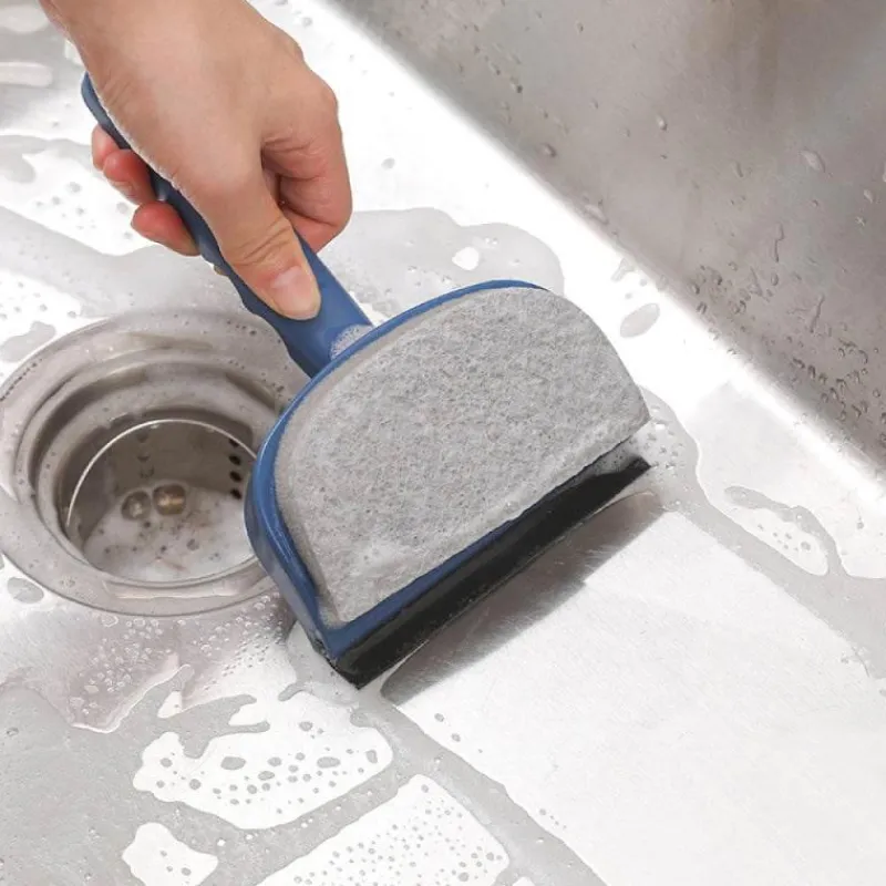 Die multifunktionale Reinigungsschwammbürste ist ein unverzichtbares Werkzeug für effektives Reinigen und Schrubben in Küche und Haushalt. Das innovative doppelseitige Design verfügt auf der einen Seite über eine weiche Schwammbürste, die sich perfekt zum sanften Abwischen von Oberflächen wie Arbeitsplatten und Fenstern eignet. Die andere Seite ist mit Gummiwischerblättern ausgestattet, die geschickt entlang einer gebogenen Kante positioniert sind, sodass Sie auch enge Stellen um Spülen und Ecken mühelos erreichen.