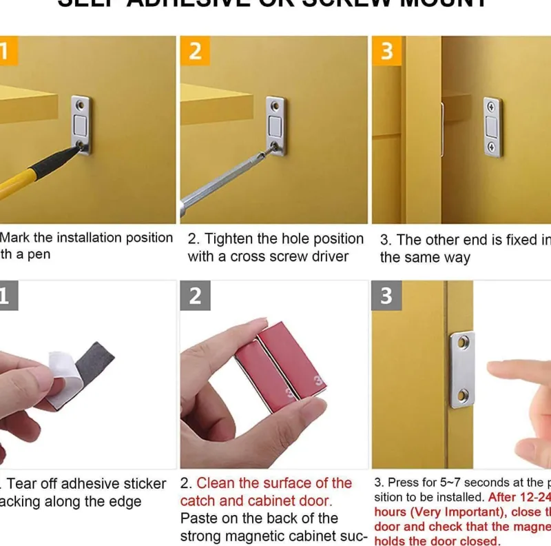 Identifizieren Sie die Innenecke der Tür, an der der Magnet mit der Schrankverkleidung ausgerichtet ist. Befestigen Sie den magnetischen, ultradünnen Schranktürstopper mit den mitgelieferten Klebestreifen oder Schrauben sicher an seinem Platz.