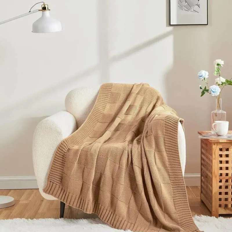 Genießen Sie den einladenden Komfort unserer karierten Strickdecke, die Ihren Raum mit Wärme und Ruhe umhüllt. Diese handgestrickte Decke besticht durch ihr kuscheliges, atmungsaktives Gewebe, das durch gerippte Kanten und ein weiches Karomuster wunderschön hervorgehoben wird. Mit großzügigen Maßen von 127 cm x 152 cm (B x L) setzt sie einen idealen Akzent in Ihrem Wohnbereich, schmiegt sich elegant über Möbel und wertet jeden Einrichtungsstil auf.