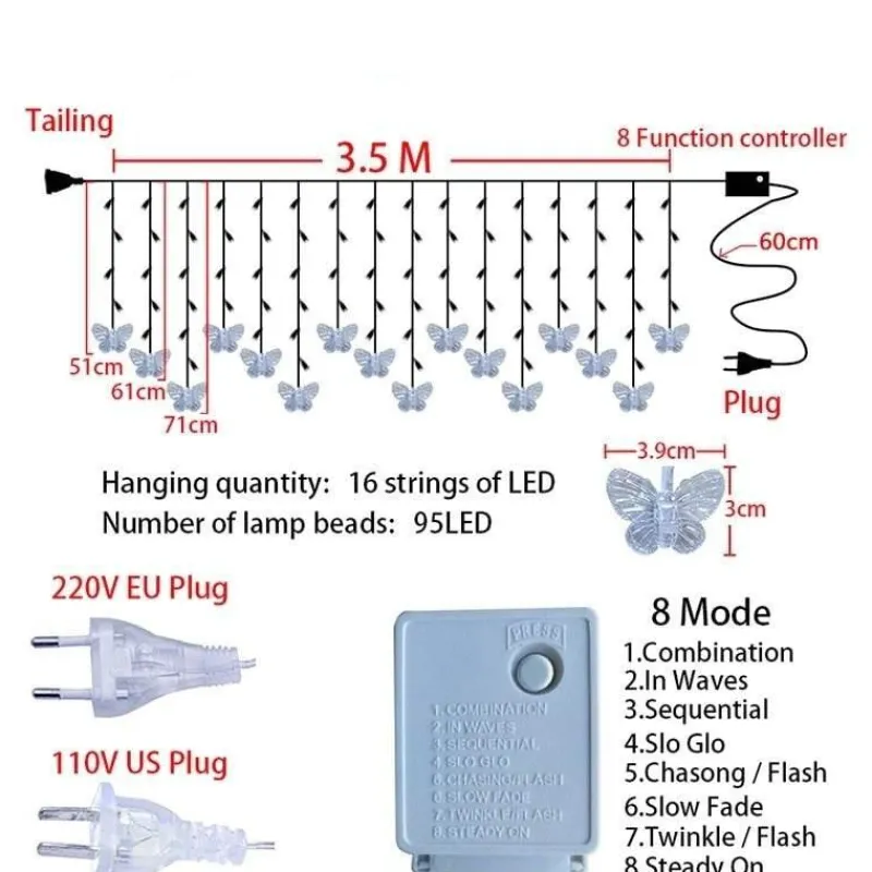 Im Lieferumfang enthalten ist ein Set Schmetterlings-LED-Lichtervorhang, der Ihre Wohndekoration oder Feierlichkeiten in einen magischen Glanz hüllt. Verschönern Sie Ihre Umgebung und lassen Sie Ihrer Kreativität freien Lauf!