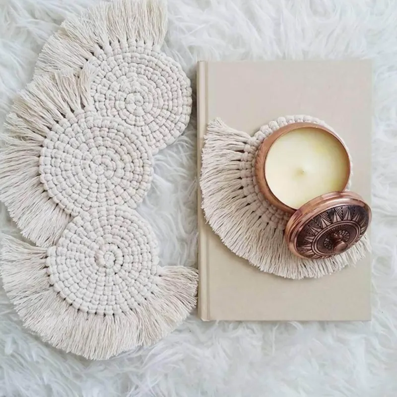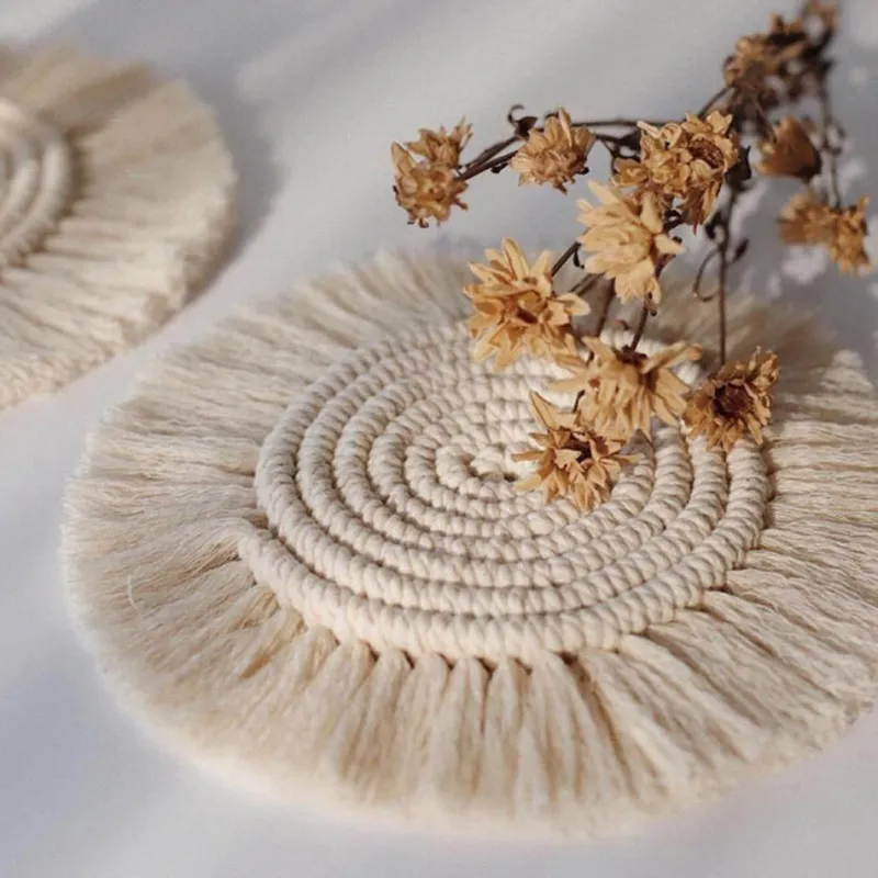 1x handgefertigter nordischer Makramee-Untersetzer.