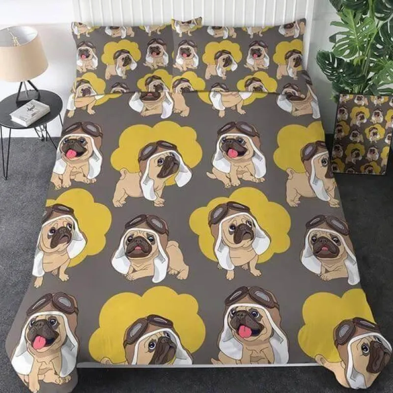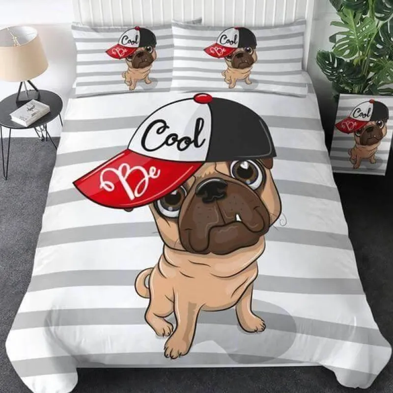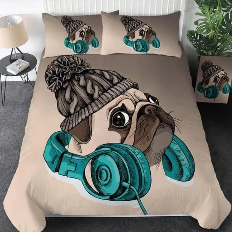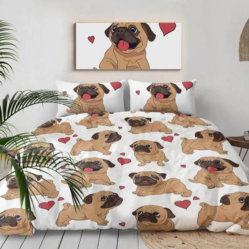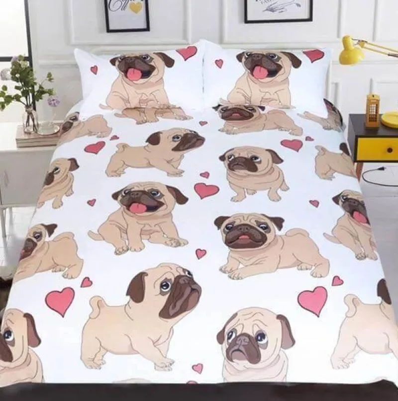 In der Box finden Sie drei Teile des Hippie-Mops-Welpen-Cartoon-Bettbezug-Sets. Lassen Sie sich vom fröhlichen Geist dieser Kollektion verzaubern und verwandeln Sie Ihr Schlafzimmer in einen einladenden Rückzugsort.