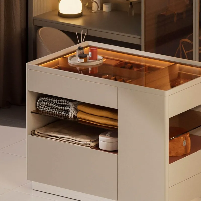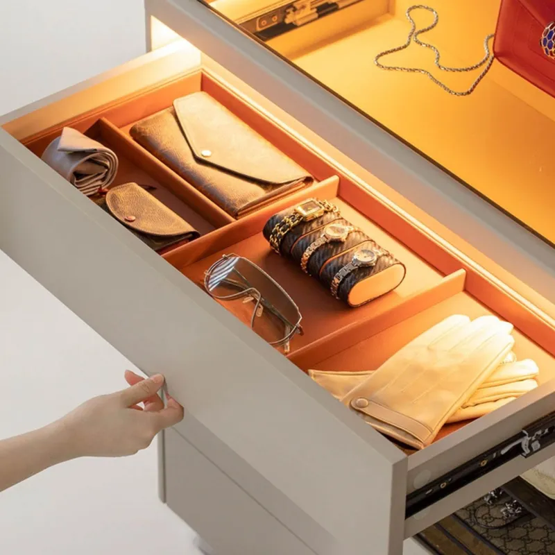 Beleuchten Sie Ihre Gegenstände ganz einfach mit einem praktischen One-Touch-Schalter an der Seite des Schranks. Zusätzlich aktiviert sich die intelligente Induktionsbeleuchtung sofort beim Öffnen der Türen und ermöglicht so mühelosen Zugriff auf Ihre Sammlung.