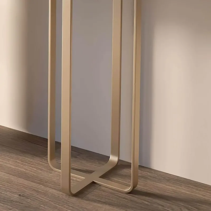 Erleben Sie mit dem Konsolentisch Marius eine harmonische Verbindung aus Luxus und modernem Design. Die eleganten Beine aus goldfarbenem Eisen verleihen diesem stilvollen Möbelstück seinem schlanken Profil einen Hauch von Raffinesse. Die Arbeitsplatte aus importiertem italienischem Schieferstein besticht durch ihre edle, strukturierte Oberfläche, die zeitlose Eleganz und unverwechselbaren Charme ausstrahlt.