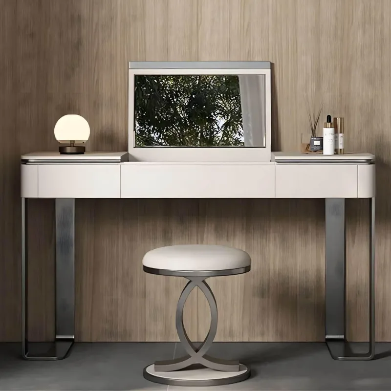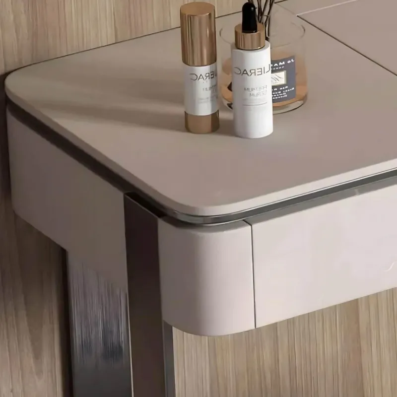 Entdecken Sie moderne Eleganz mit dem Ivano Frisiertisch, einem durchdachten Schminktisch, der als platzsparende Lösung für jedes Schlafzimmer oder Ankleidezimmer dient. Dieses stilvolle Möbelstück verfügt über einen integrierten Spiegel, der sich mühelos in die Arbeitsplatte einklappen lässt und so Komfort und Flexibilität im Alltag bietet. Die massiven Edelstahlbeine des Frisiertisches versprechen Langlebigkeit und verleihen Ihrem Raum einen Hauch von Eleganz.