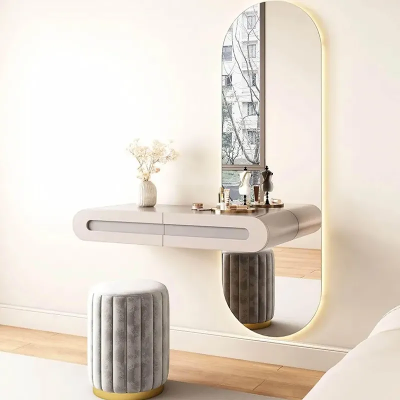 Werten Sie Ihren Raum mit dem Sante Frisiertisch auf, einem sorgfältig gefertigten Schminktisch, der moderne Eleganz mit praktischer Funktionalität verbindet. Dieser stilvolle, wandmontierte Frisiertisch verfügt über einen großen, ovalen LED-beleuchteten Spiegel, der für helles und einladendes Licht sorgt und Ihre Körperpflege erleichtert. Sein kompaktes Design macht ihn zur idealen Wahl für kleinere Bereiche und maximiert den Nutzen, ohne Kompromisse beim Stil einzugehen.