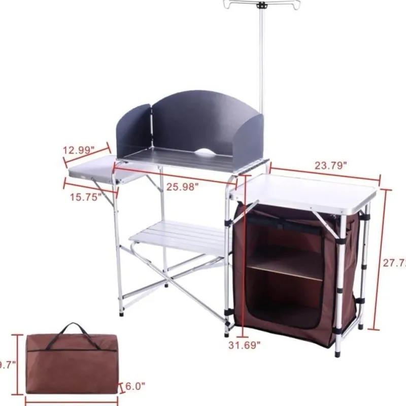Entdecken Sie die ultimative Lösung für das Kochen im Freien mit dieser tragbaren Campingküche, die für Komfort und Funktionalität bei Ihren Outdoor-Abenteuern konzipiert ist. Diese vielseitige Kochstation bietet Platz für alle wichtigen Küchenutensilien, Kochgeschirr, Geschirr, Topflappen, Kleidung und mehr und eignet sich perfekt für Campingausflüge, Picknicks oder sogar als praktische Outdoor-Bar.