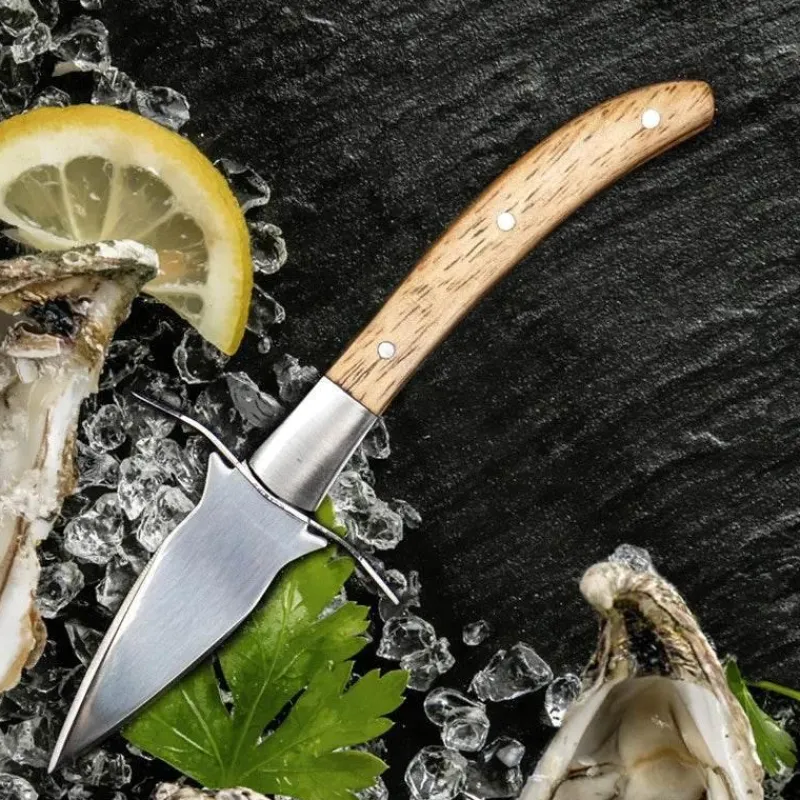 Wir präsentieren unser fachmännisch gefertigtes Austernmesser – ein unverzichtbares Werkzeug für Meeresfrüchte-Liebhaber. Dieses Austernmesser aus Edelstahl verfügt über einen formschönen Holzgriff, der Komfort und Stil beim mühelosen Austernöffnen gewährleistet.