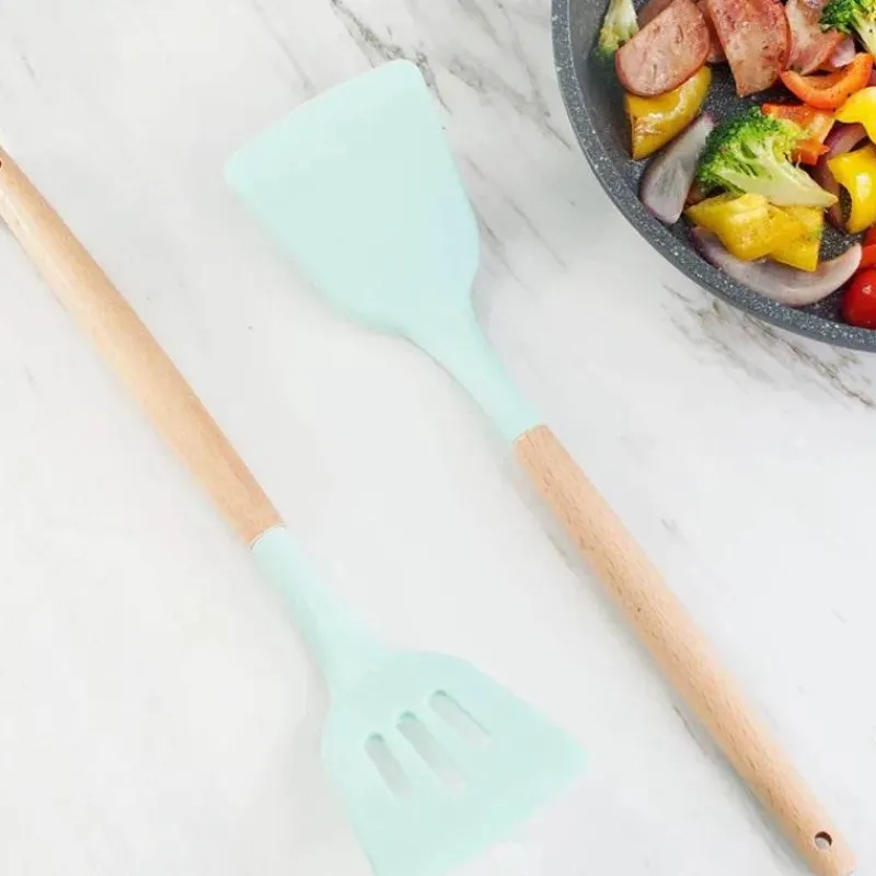 Erleben Sie die Vielseitigkeit unseres Silikon-Küchenutensilien-Sets mit eleganten Holzgriffen – ein Must-have für Ihre kulinarische Reise. Hergestellt aus hochwertigem Silikon bieten diese Utensilien eine perfekte Kombination aus Langlebigkeit und ansprechender Optik und eignen sich somit ideal für den täglichen Kochalltag.