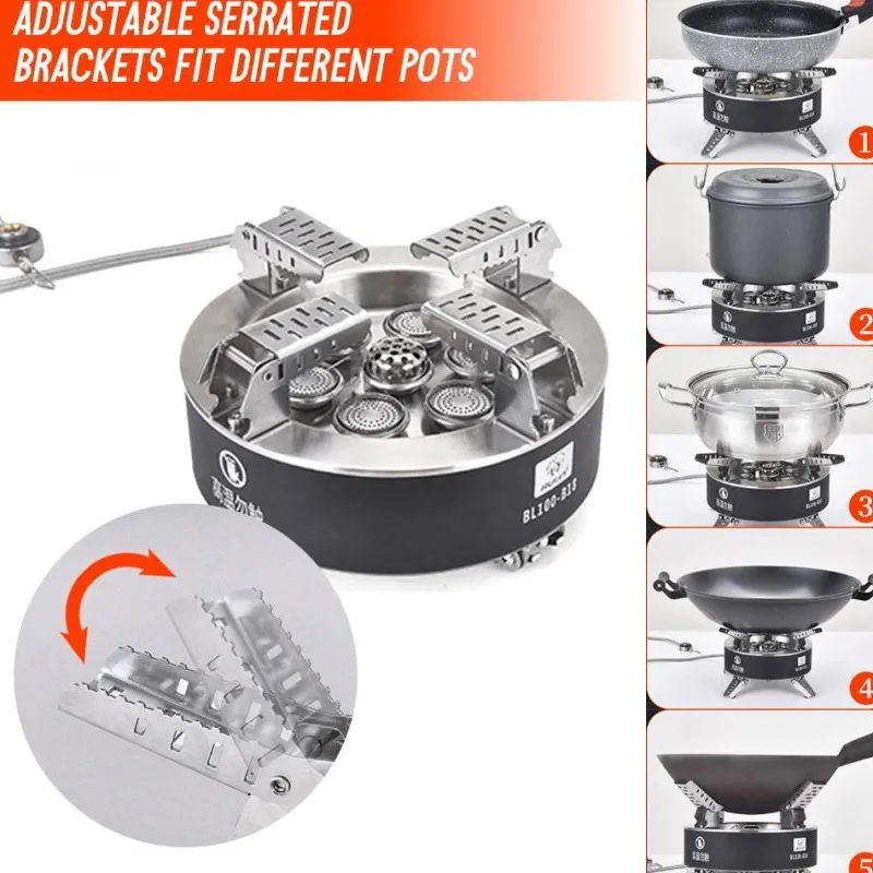 Dieser Herd mit beeindruckenden 18.000 Watt Leistung verfügt über fünf effiziente Edelstahlbrenner, die eine gleichmäßige Wärmeverteilung für gleichbleibende Kochergebnisse gewährleisten. Das einstellbare Sicherheitsventil ermöglicht eine präzise Steuerung des Gasflusses und sorgt so für sicheres Kochen. Die verstellbaren, gezackten Halterungen halten Töpfe verschiedener Größen sicher und tragen ein maximales Gewicht von 75 kg.