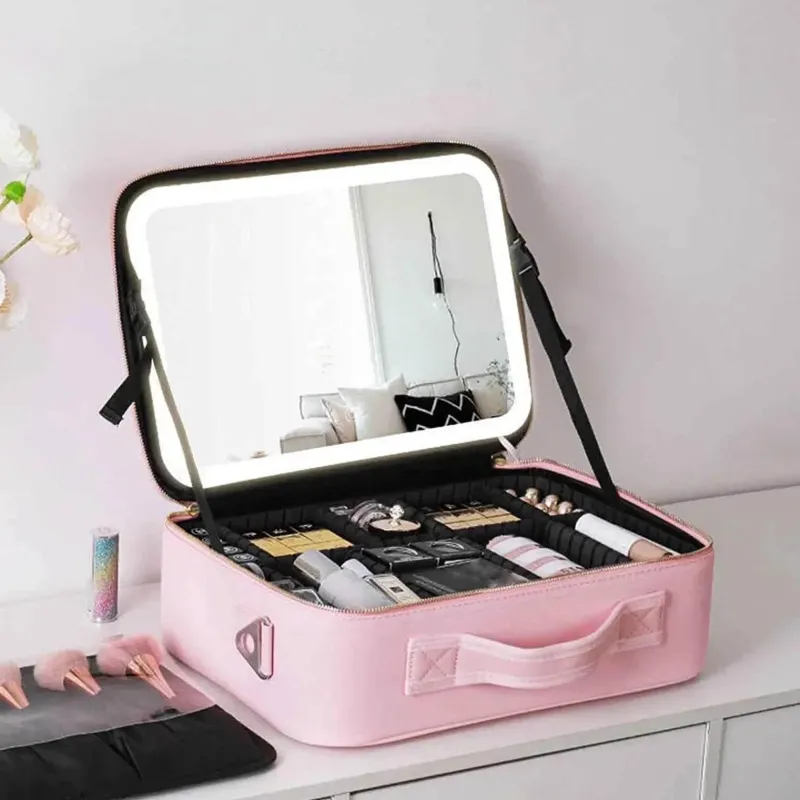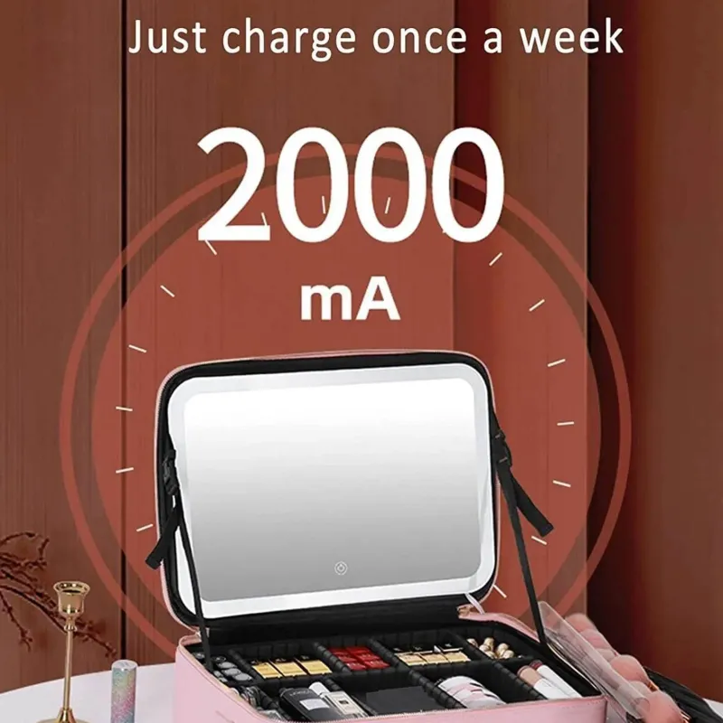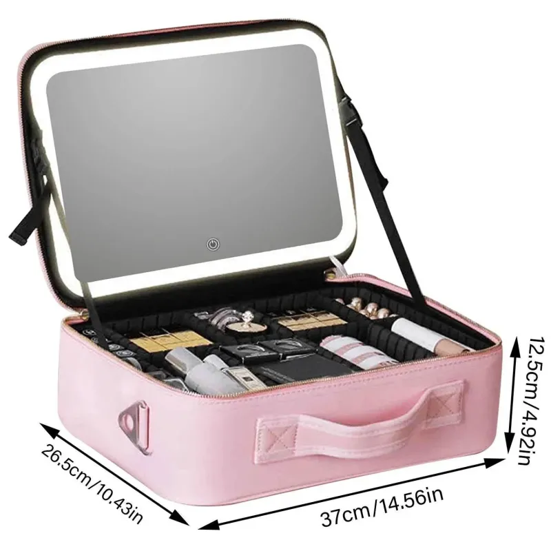 * **Doppelfunktion:** Diese Tasche kombiniert nahtlos die Zweckmäßigkeit eines Kosmetikkoffers mit dem Luxus eines eingebauten beleuchteten Spiegels und ist somit perfekt zum Schminken – jederzeit und überall.