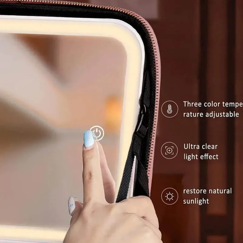 Die LED-Kosmetiktasche mit Spiegel ist ein unverzichtbarer Beauty-Begleiter für den modernen, mobilen Lebensstil. Dieser anpassungsfähige Reise-Kosmetik-Organizer verfügt über einen 4K-Vollbildspiegel mit einstellbarer Helligkeit und drei Farbtemperaturmodi: Kaltlicht, Tageslicht und Warmlicht. So gelingt Ihnen ein makelloses Make-up, egal ob Sie sich für einen eleganten Abend vorbereiten oder tagsüber schnell etwas auffrischen möchten. Diese Kosmetiktasche aus strapazierfähigem PU-Leder ist mit hochwertigen, wasserdichten Reißverschlüssen ausgestattet, die Ihre Kosmetik sicher aufbewahren und gleichzeitig einfachen Zugriff auf alle Ihre Beauty-Essentials ermöglichen.