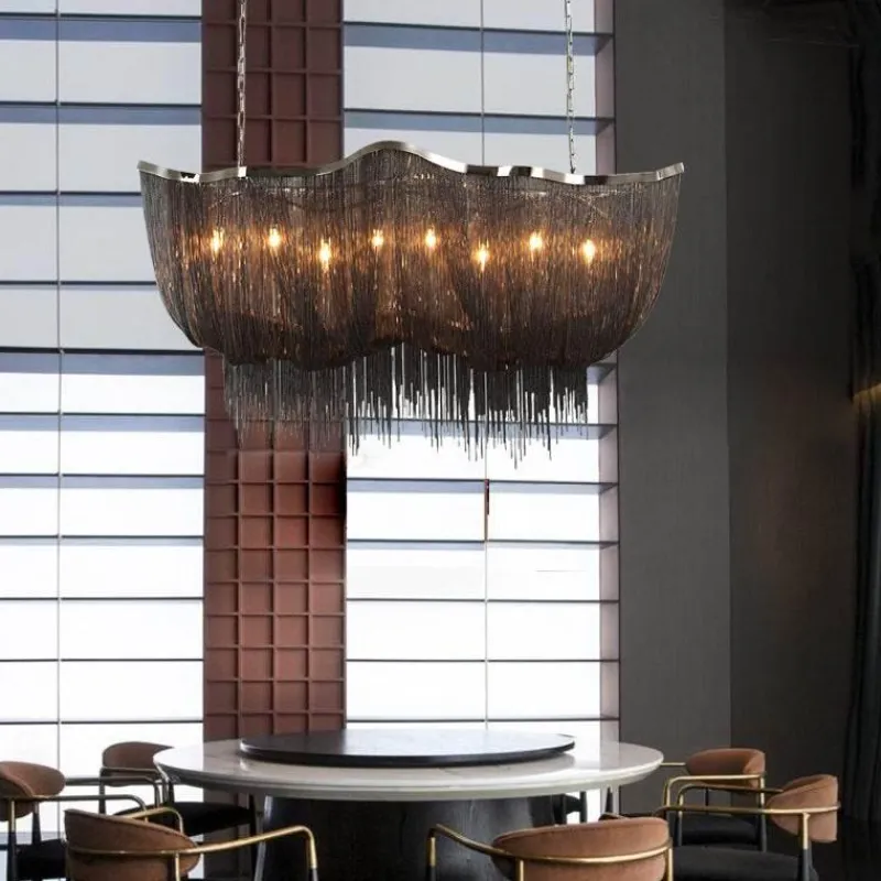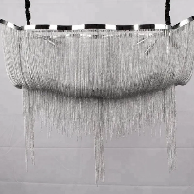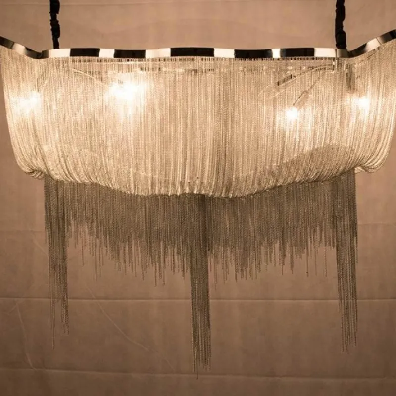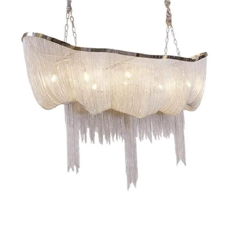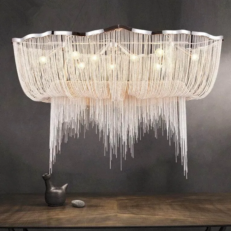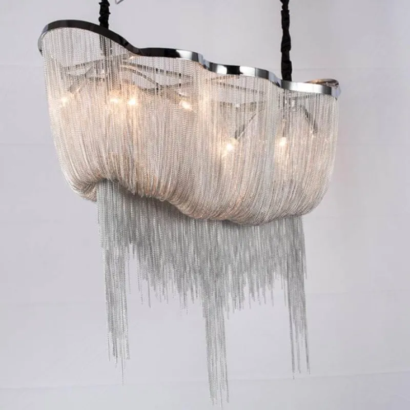 Dieser aus robustem Metall gefertigte Kronleuchter mit Aluminiumkette misst L120 x B40 x H90 cm (47,24 x 15,75 x 35,43 Zoll) und hat ein elegantes Silber-Finish, das zu verschiedenen Einrichtungsstilen passt.