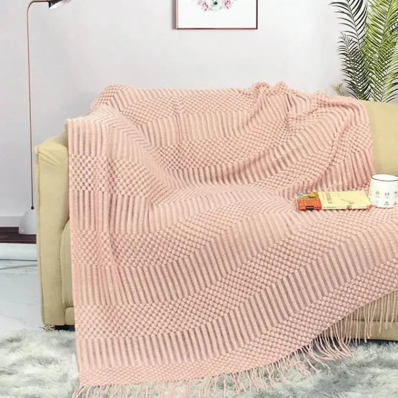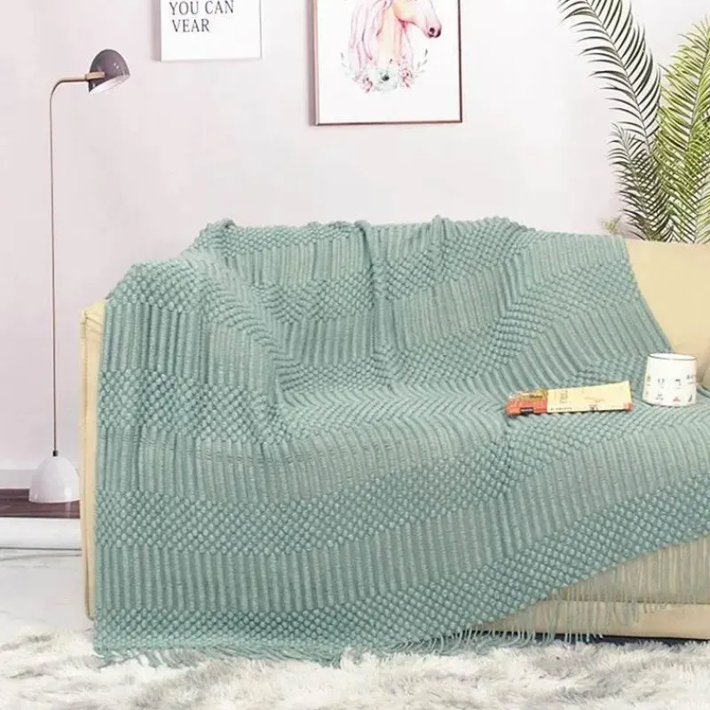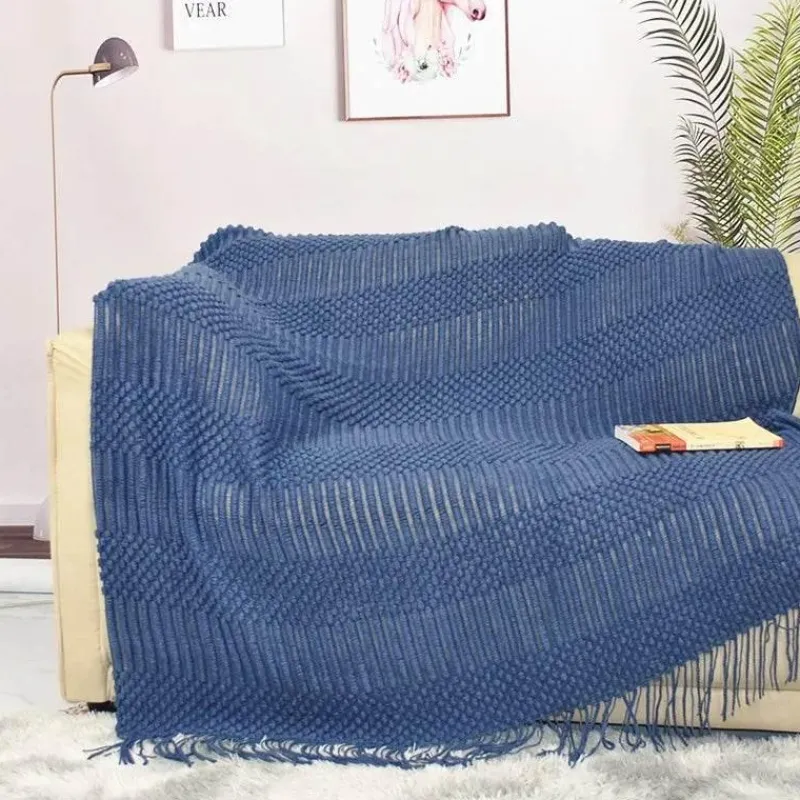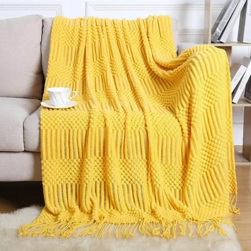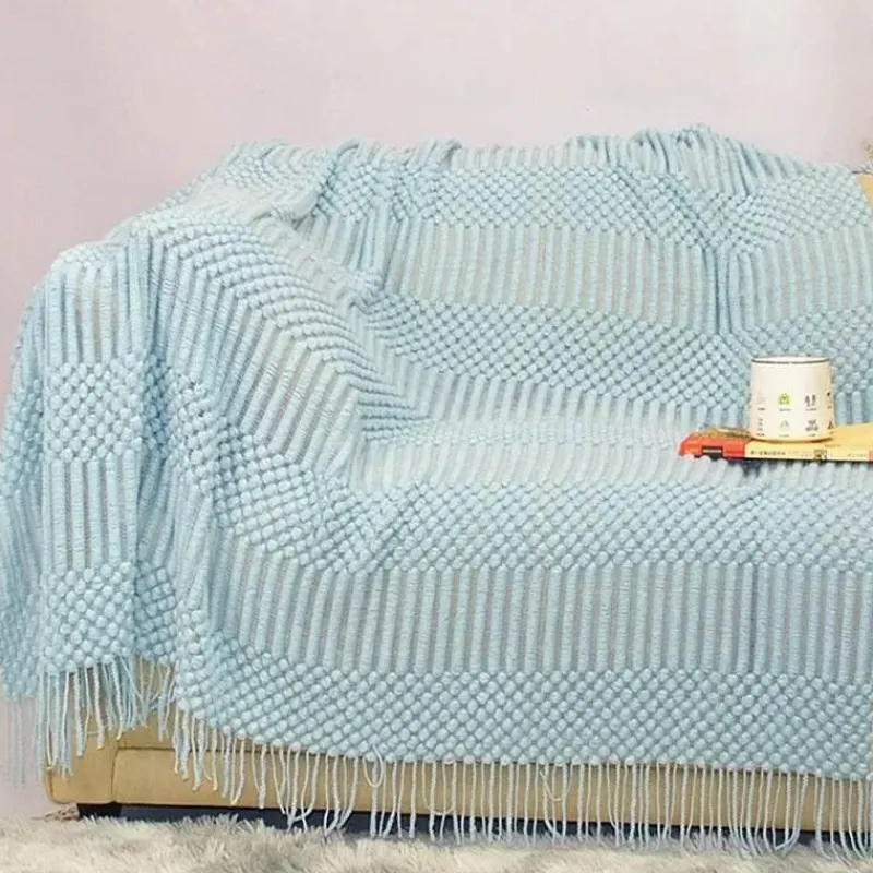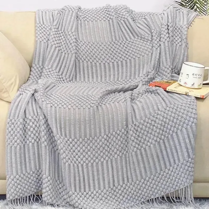 Mit ihrem filigranen geometrischen Muster eignet sich diese hochwertige Garndecke ideal als Überwurf für Sofa oder Bett und ist gleichzeitig ein vielseitiges Accessoire für Picknicks, Reisen, Krankenhausaufenthalte und vieles mehr. Dank ihrer rechteckigen Form und des leichten Designs ist sie leicht zu tragen und bietet Komfort und Wärme, wohin auch immer Ihre Abenteuer Sie führen.