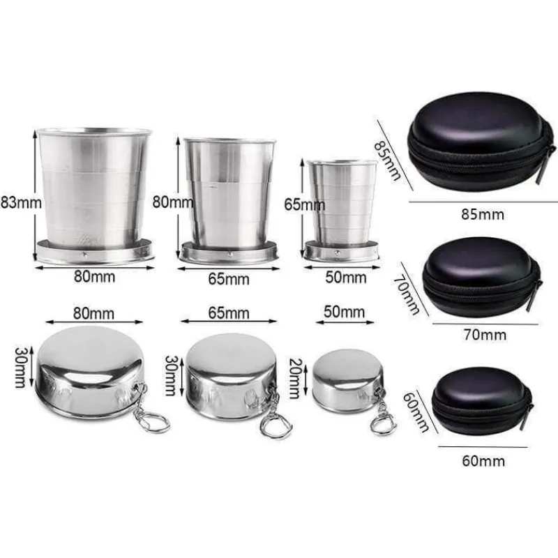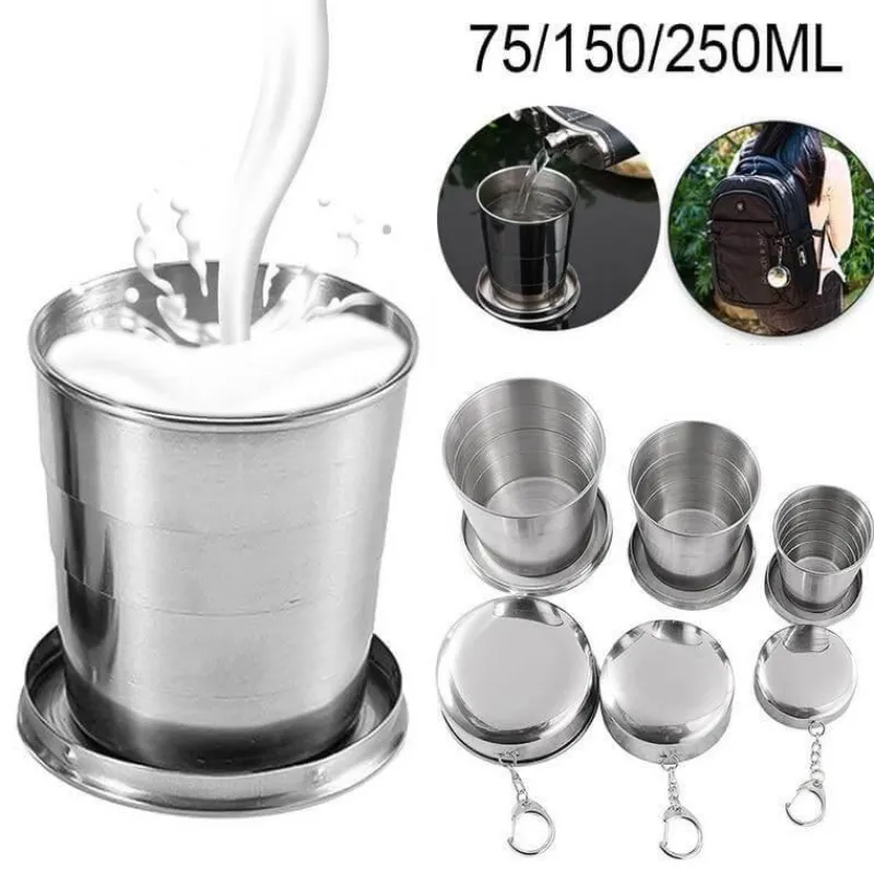 Mit diesem tragbaren und zusammenklappbaren Campingbecher aus Edelstahl bleiben Sie bei Ihrem nächsten Abenteuer stets hydriert. Er ist praktisch und lässt sich leicht auf einen Bruchteil seiner Größe komprimieren, sodass er sich problemlos in der Tasche oder Handtasche transportieren lässt. Dieser vielseitige Faltbecher ist ein unverzichtbares Reiseaccessoire für Outdoor-Fans und begleitet Sie problemlos auf Wanderungen, Campingausflügen oder Picknicks.