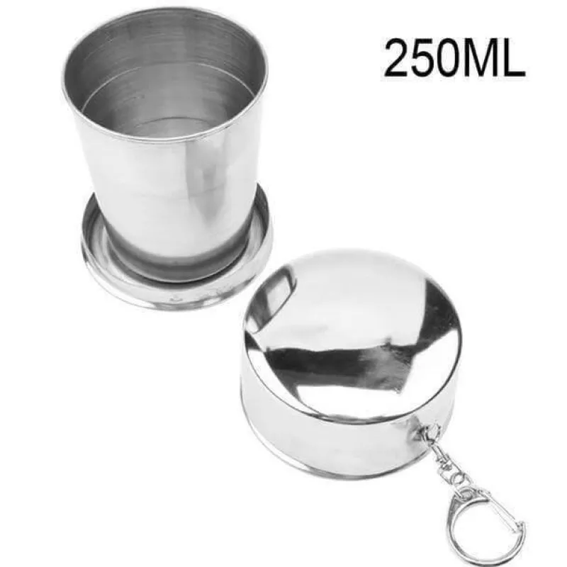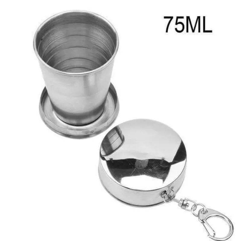 1 x faltbarer, tragbarer Campingbecher aus Edelstahl mit Schlüsselanhänger.