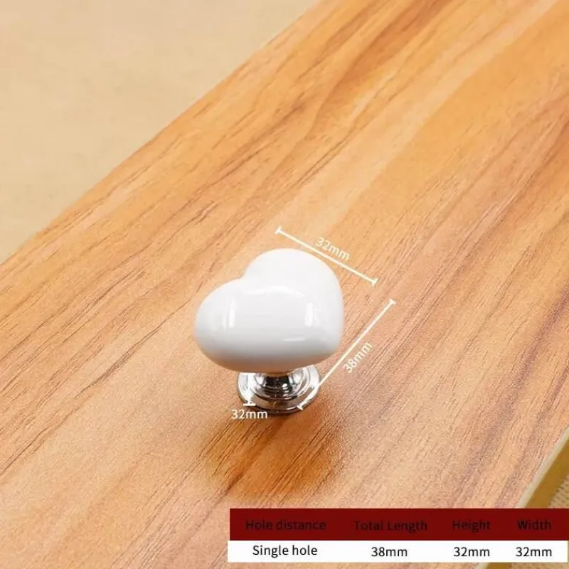 Im Lieferumfang enthalten ist ein Keramik-Herz-Türgriff für Schränke, der Ihre Einrichtung mit seiner verspielten und zugleich edlen Optik aufwertet. Ob Sie alte Möbelstücke auffrischen oder neue Projekte realisieren – dieser Griff ist die ideale Wahl, um Ihrem Zuhause eine persönliche Note zu verleihen.