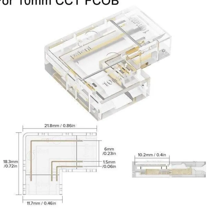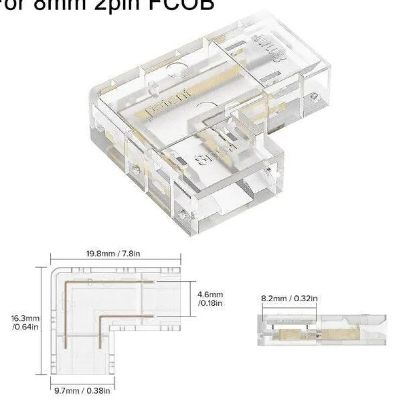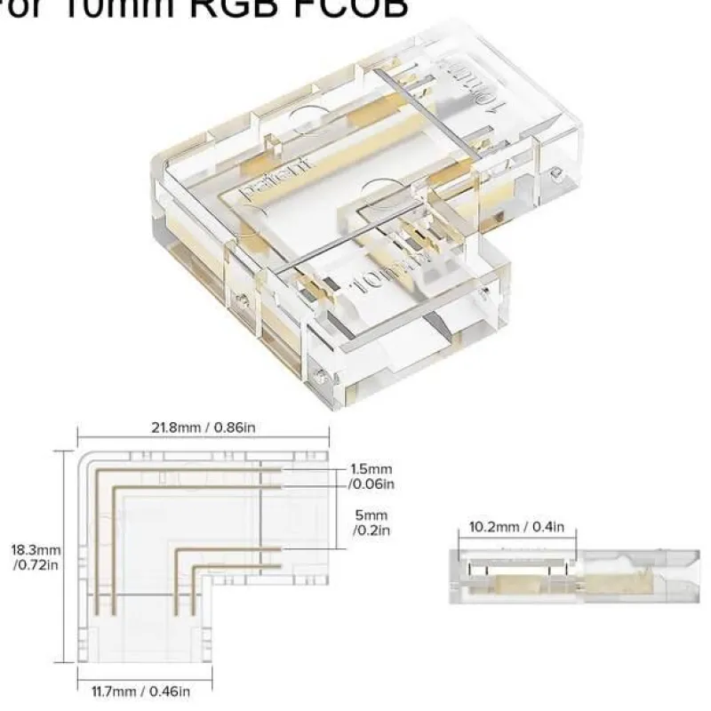 Das L-förmige Design ermöglicht die einfache Installation in Ecken oder anderen rechtwinkligen Konfigurationen und eignet sich daher hervorragend für individuelle Beleuchtungsarrangements. Egal, ob Sie mit FCOB-Streifen mit zwei Stiften (8 mm oder 10 mm) oder drei Stiften (10 mm) arbeiten, dieser Anschluss gewährleistet eine zuverlässige Verbindung.
